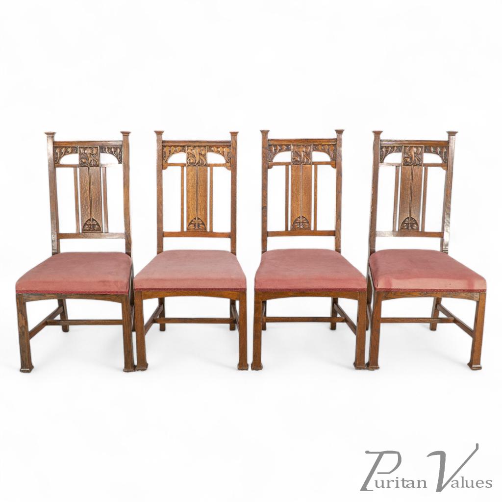 Set of four dining chairs in oak, of the Arts and Crafts movement (1880–1910), c.1900. The group forms a compact suite intended for domestic dining or a modest dining hall and demonstrates the period preference for upright, rectilinear seating with modest decorative carving.