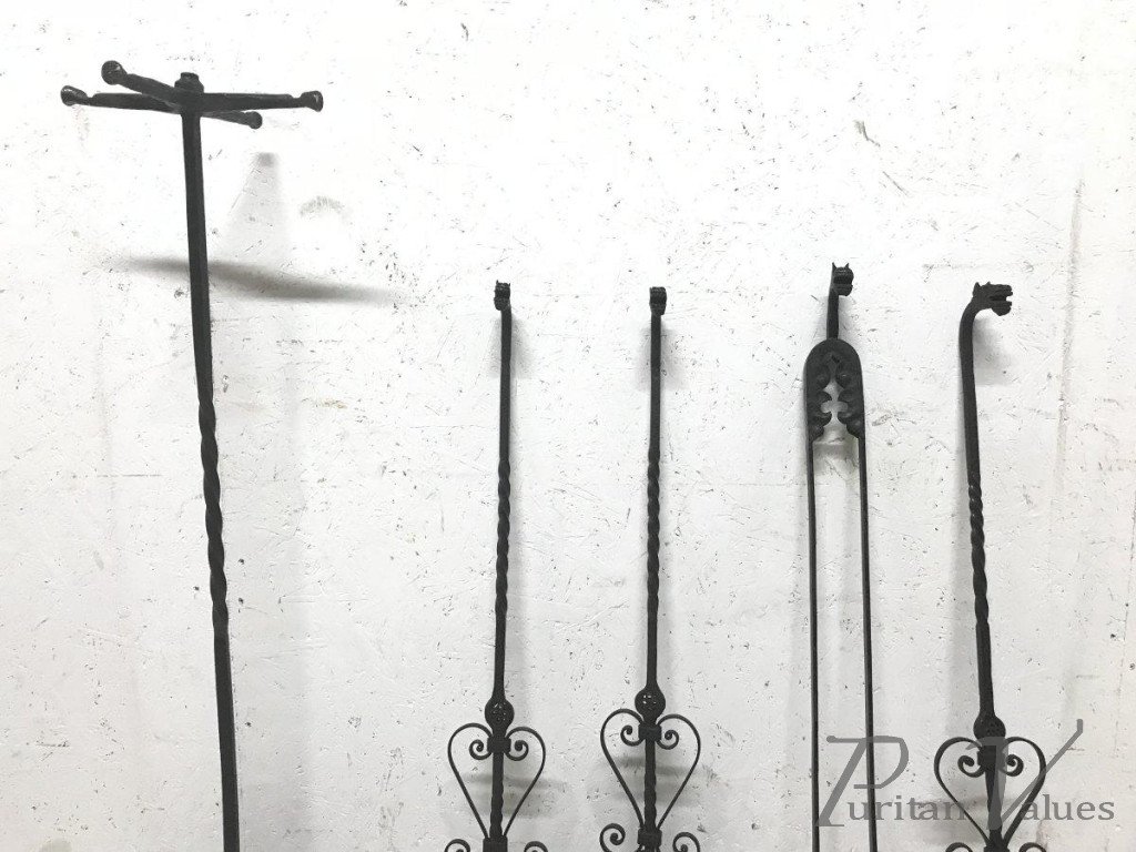 Set of Four Arts & Crafts Hand-Forged Iron Fire Utensils on a Matching Stand