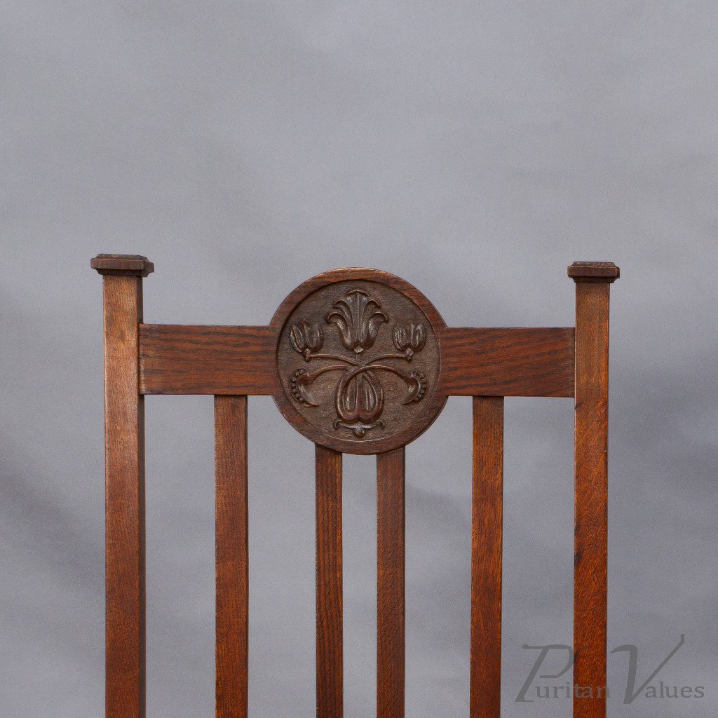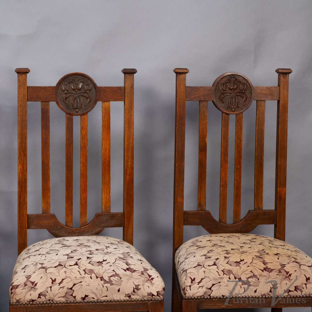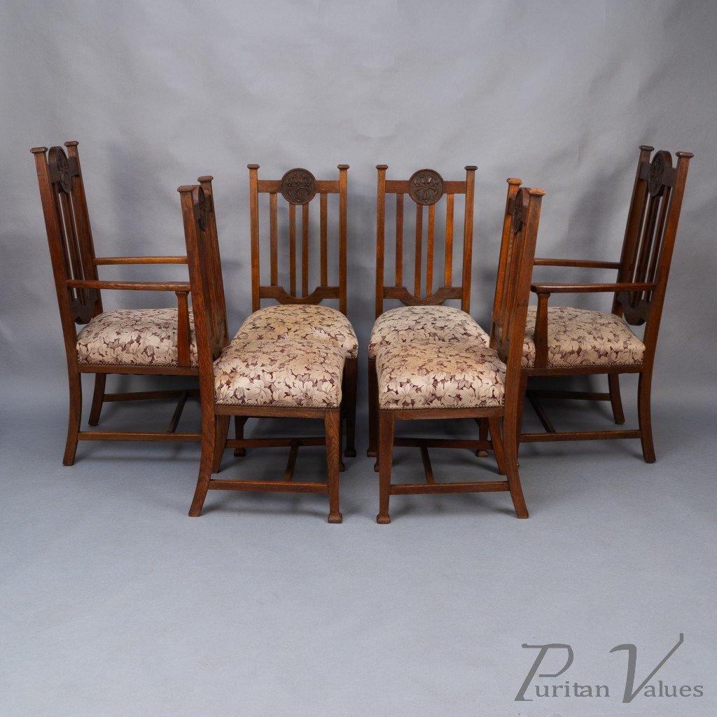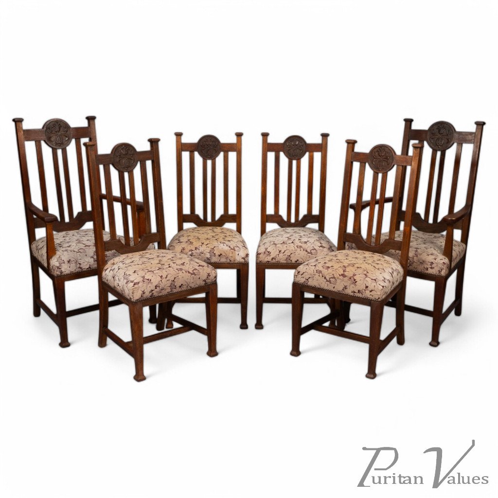 Set of Six English Arts & Crafts Oak Dining Chairs with Carved Floral Roundels