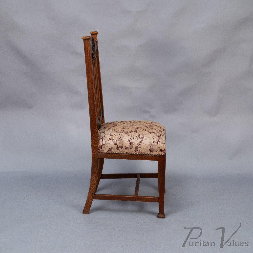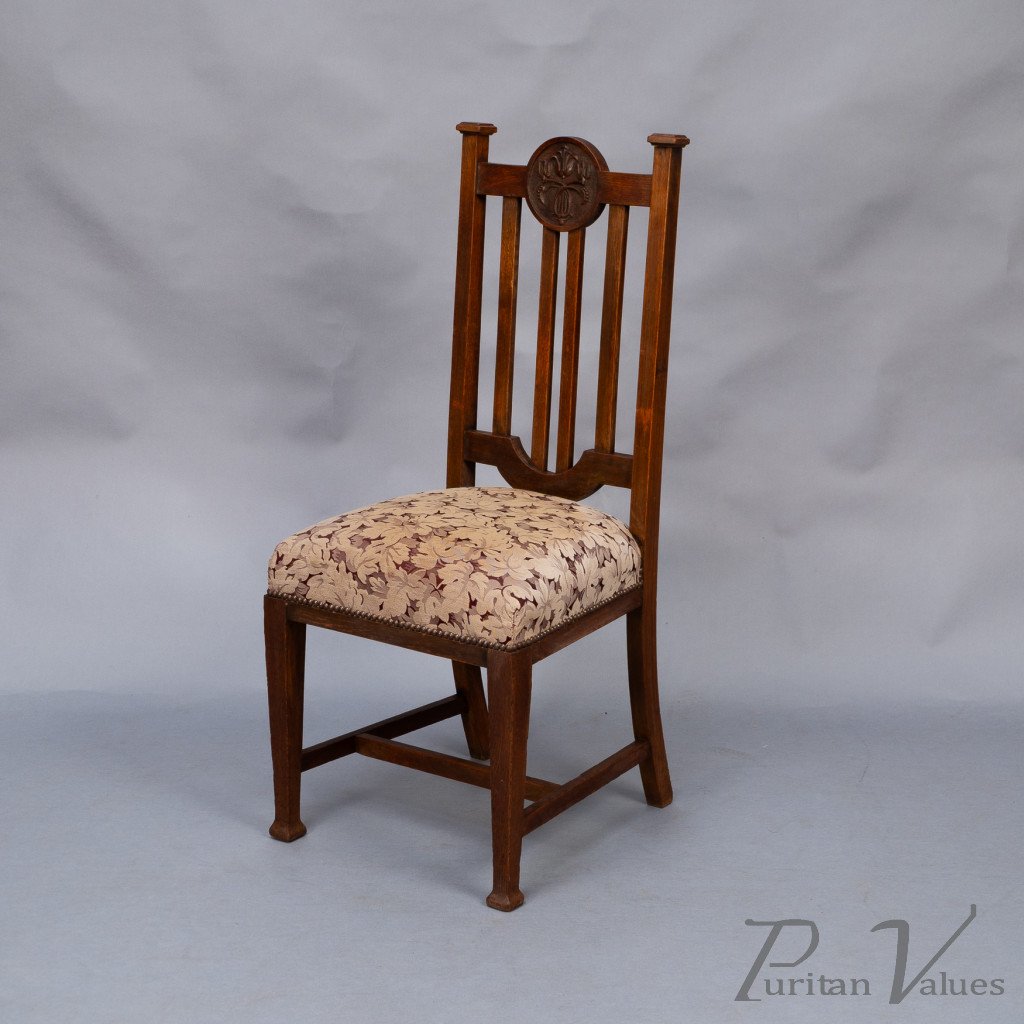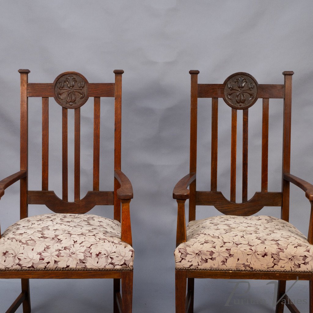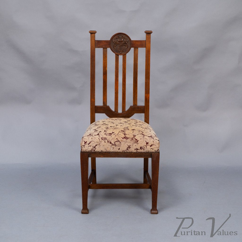 Set of Six English Arts & Crafts Oak Dining Chairs with Carved Floral Roundels