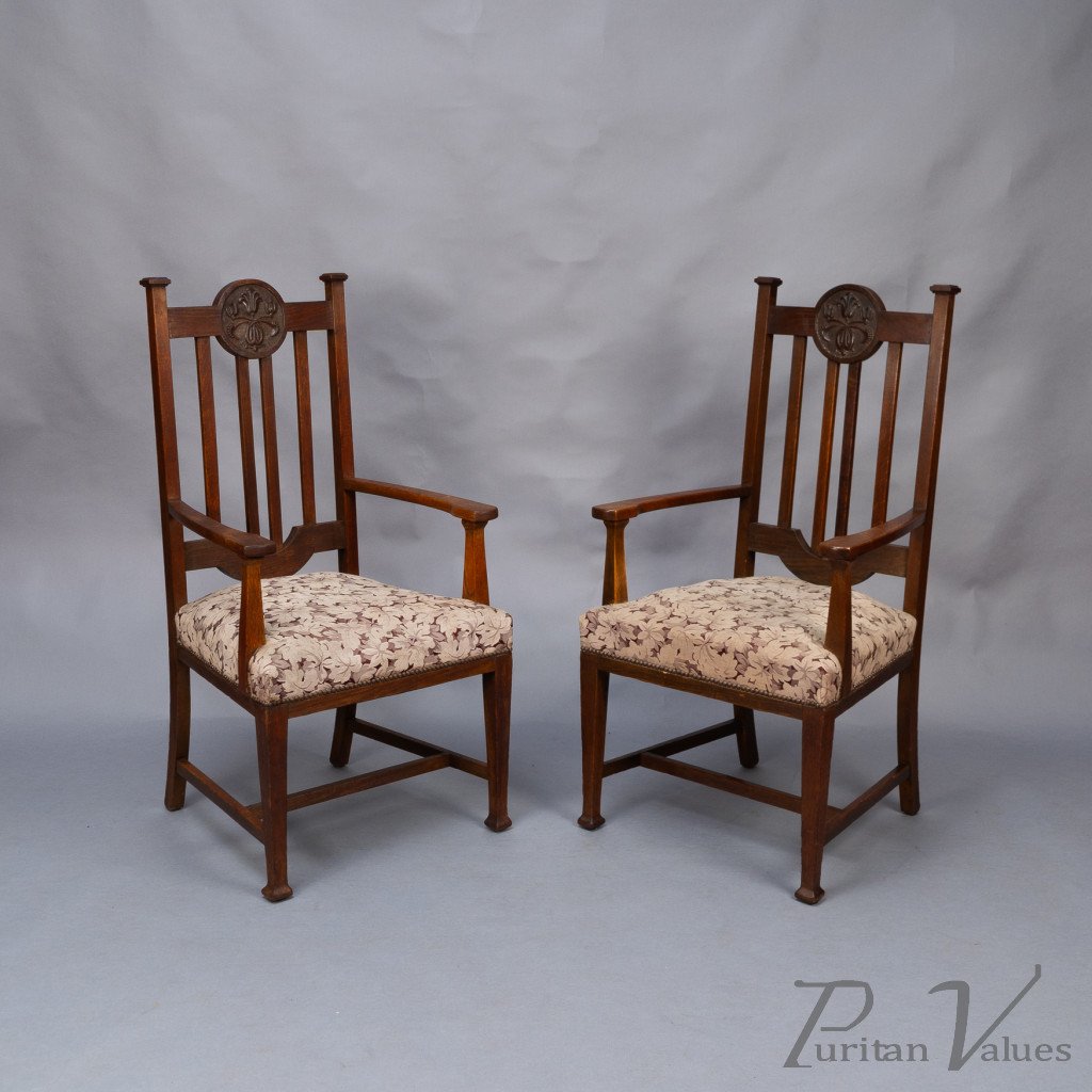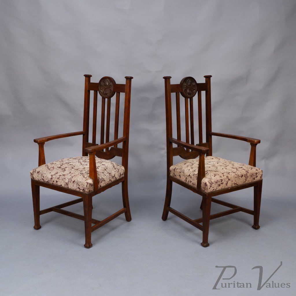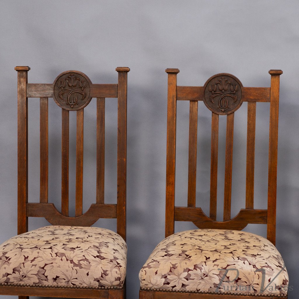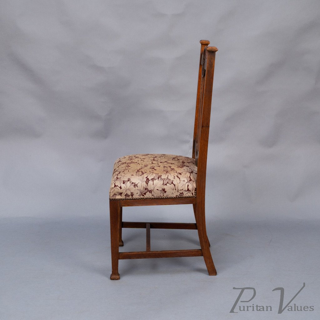 Set of Six English Arts & Crafts Oak Dining Chairs with Carved Floral Roundels