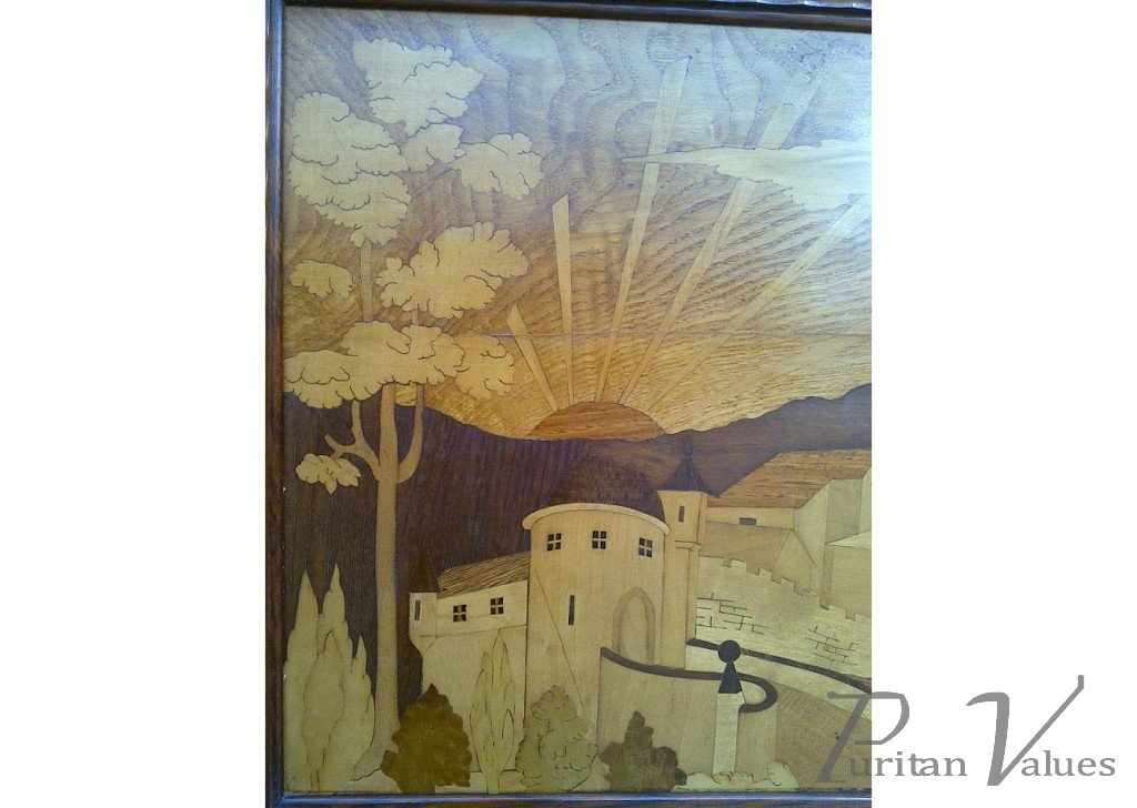 A Shapland and Petter bureau bookcase with a beautiful marquetry panel of a castle within a wall and the sun shining upon it. An identical Bureau bookcase with a copper panel to the front is illustrated on the front cover of Daryl Bennets ‘Shapland and Petter Ltd of Barnstaple: Arts and Crafts Furniture’ Barnstaple 2005 book on Shapland and Petter Height 61", Width 38", Depth 17". Circa 1900 .