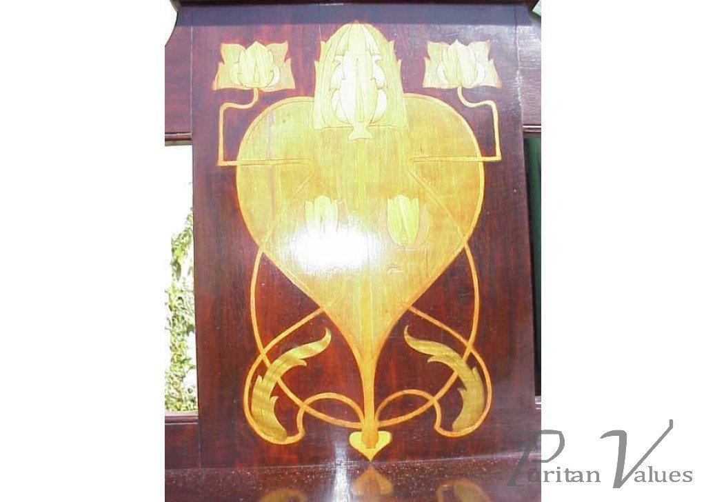A display cabinet by Shapland and Petter of Barnstaple, with stylised floral inlay's. Height 67", Depth 14", Width from cap to cap 47". Circa 1900.