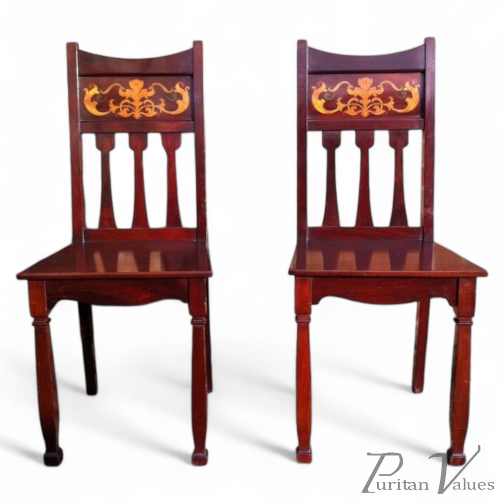 A pair of Arts and Crafts hall chairs by Shapland and Petter with stylised floral inlays to the backs and shaped front legs, in good original condition Circa 1900.