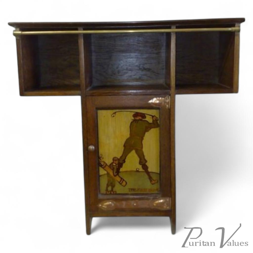 Shapland and Petter. A wall cabinet with Golfing panel and copper strap hinges. Circa 1900.