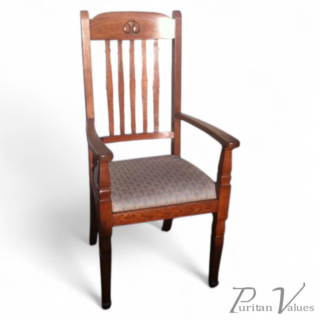 An Arts and Crafts oak armchair by Shapland and Petter with stylised floral details to the head rest, shaped back splats and shaped legs. Circa 1900.