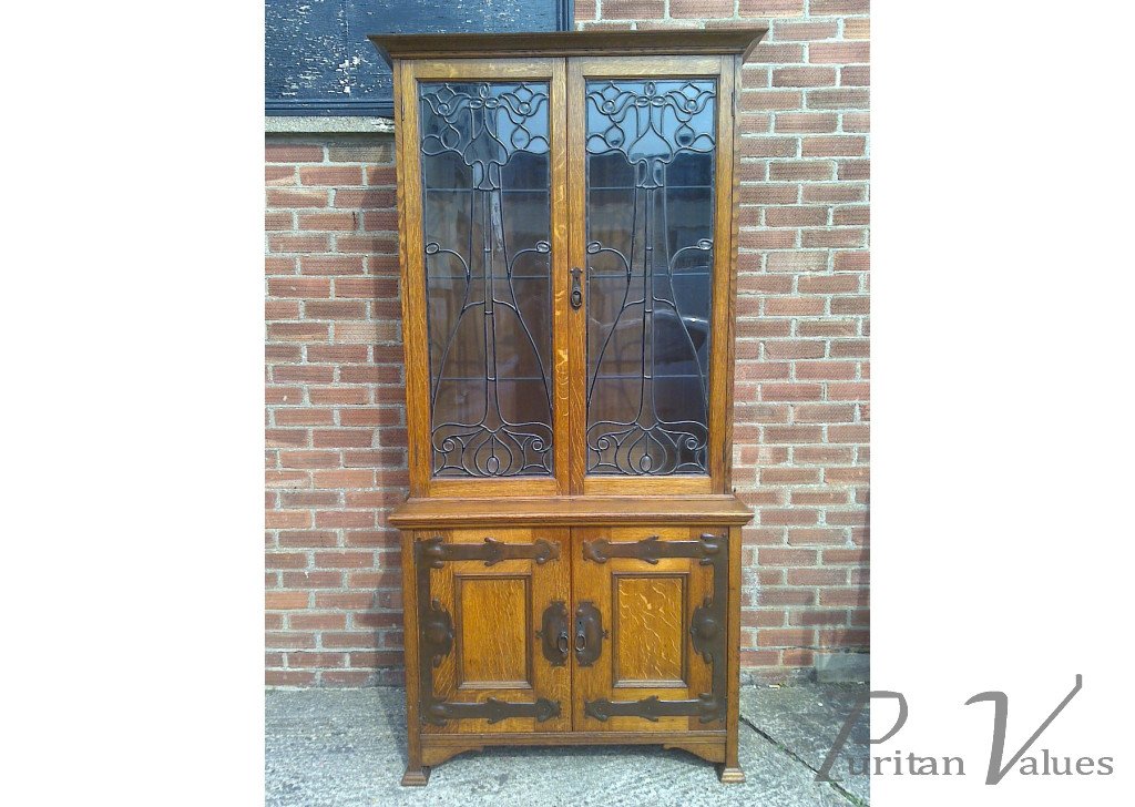 An Arts and Crafts oak bookcase by Shapland and Petter of superior quality with flaring cornice and good stylised floral work to the stain glass doors with impressive copper elongated vertical strap hinges to the lower panelled doors and conforming stylised copper handles. The whole stood on square pad feet with shaped brackets above and shaped details to the lower sides. Height 86", Width of cornice 46 1/2", Depth of base 18 1/2". Circa 1900.