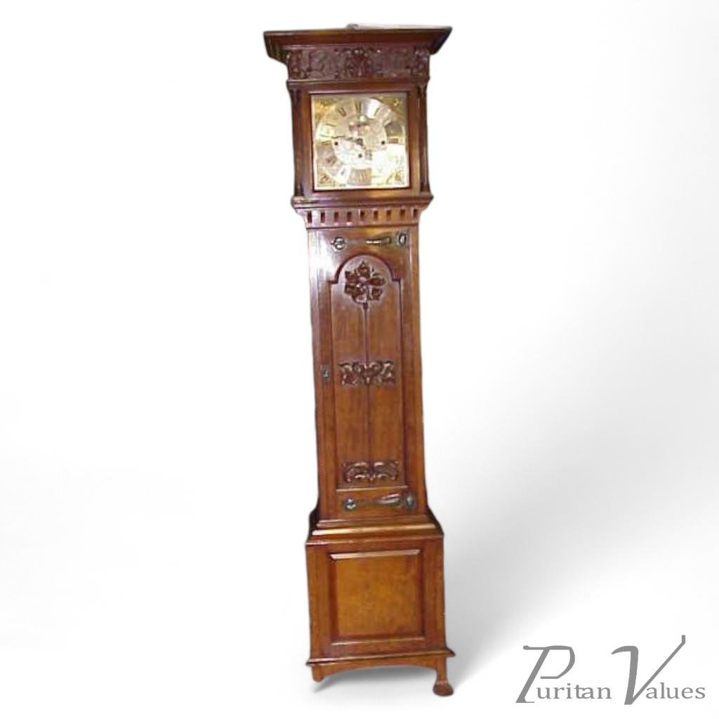 A Shapland and Petter Arts and Crafts oak Grandfather clock of superior quality with stylised floral carving just below the flaring cornice. A silvered dial with engraved details depicting a cottage scene with a windmill. A castle and man rowing a boat on a lake all set in a valley with a second hand dial to the inner top and cornered with decorative Gilt Angelic heads entwined in foliage flanked by fluted pillars, the central door carved with a single stylised flower of pure design and copper strap hinges with enamelled ying yang's and enamelled ovals to each end and the sweetest enamelled escution with stylised floral details, the lower section with a walnut panel to the centre and standing on flaring square feet with arched detail. Circa late 1890's. SOLD. Although SandP were a massive commercial company who had an enormous output they produced very few Grandfather clocks and I have only ever come across this one in twenty years of specialising in the Arts and Crafts Movement and there has been no period pictures found in any of their own trade catalogues or any images in old magazines or any other articles produced at the time they were manufacturing which would almost certainly prove that this was a commissioned piece, couple with the fact that I found it in Argentina where SandP exported many items to order and although it was the richest place in the world due to their beef exports at that time they didn't have an industrial revolution happening then so they came to Europe and purchased the best of what we had to offer.