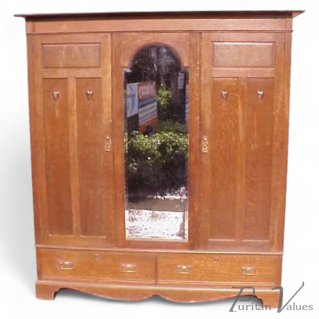 An Arts and Crafts oak treble wardrobe and dressing table