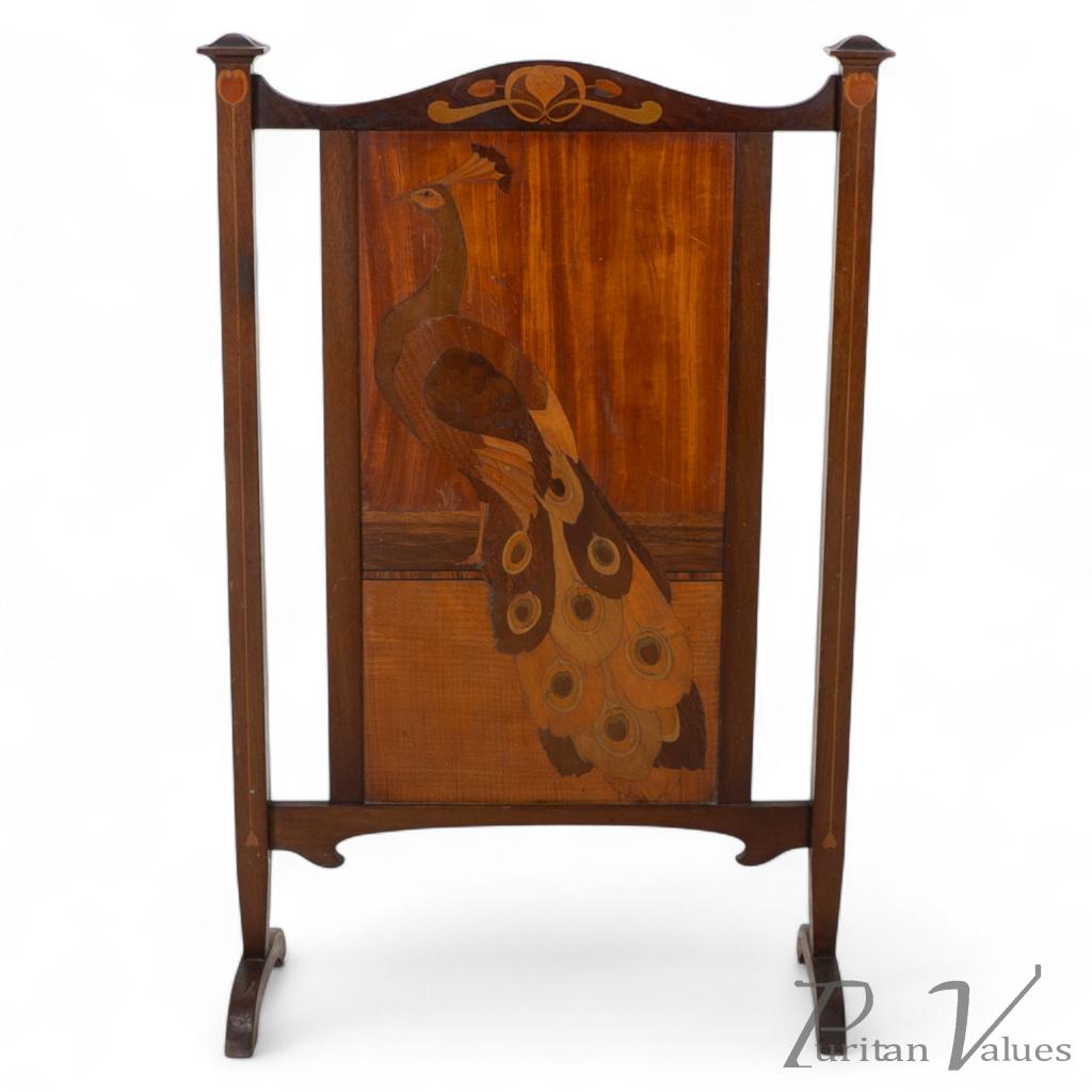 An Arts and Crafts fire screen with a shaped top pierced with a heart and floral inlay, with a beautiful peacock inlaid to the center.