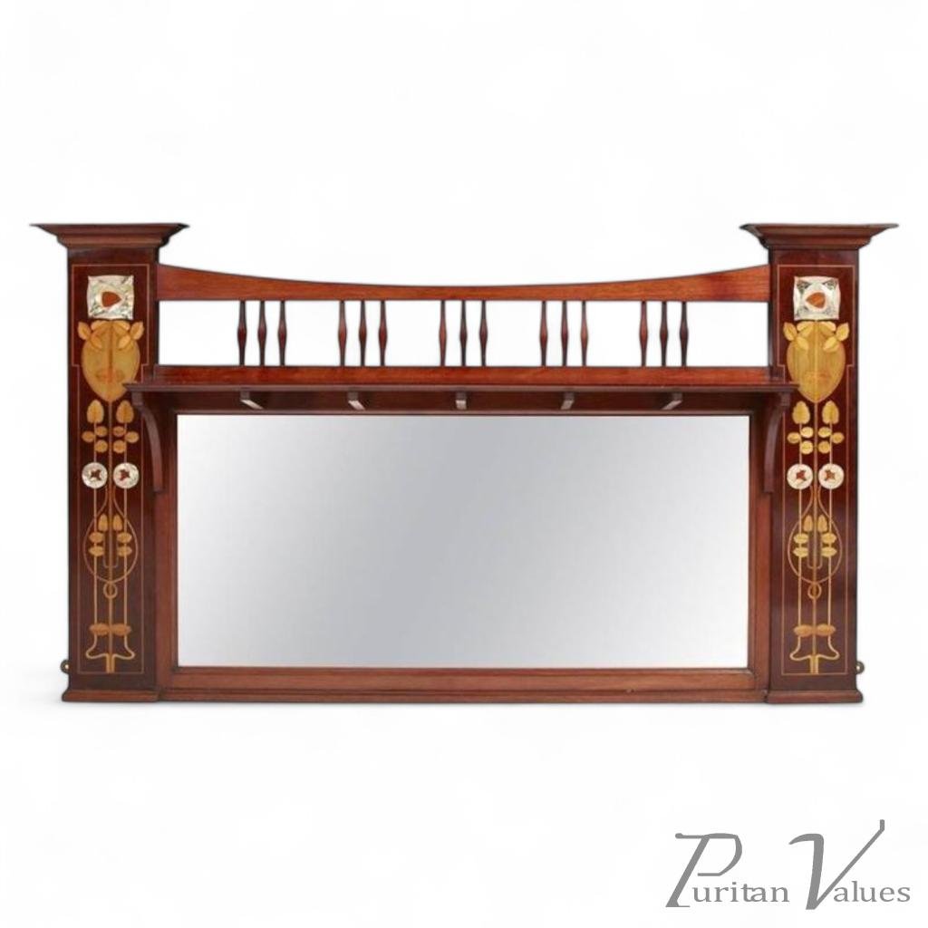 An exhibition quality Arts Crafts mahogany Mirror by Shapland Petter of generous proportions measuring almost 5' wide and almost 3' high with Mother Of Pearl and Fruitwood stylized Glasgow Rose and Floral Inlaid details to each side. The upper section with the typical in house style SP shaped spindles with a long shelf in front just above the original bevelled plate glass. This is the biggest mirror by Shapland and Petter I have ever seen in 31 years specializing in the Arts and Crafts Movement. A beautiful work of art. Circa 1900. Height 33", Width 57", Depth 3".