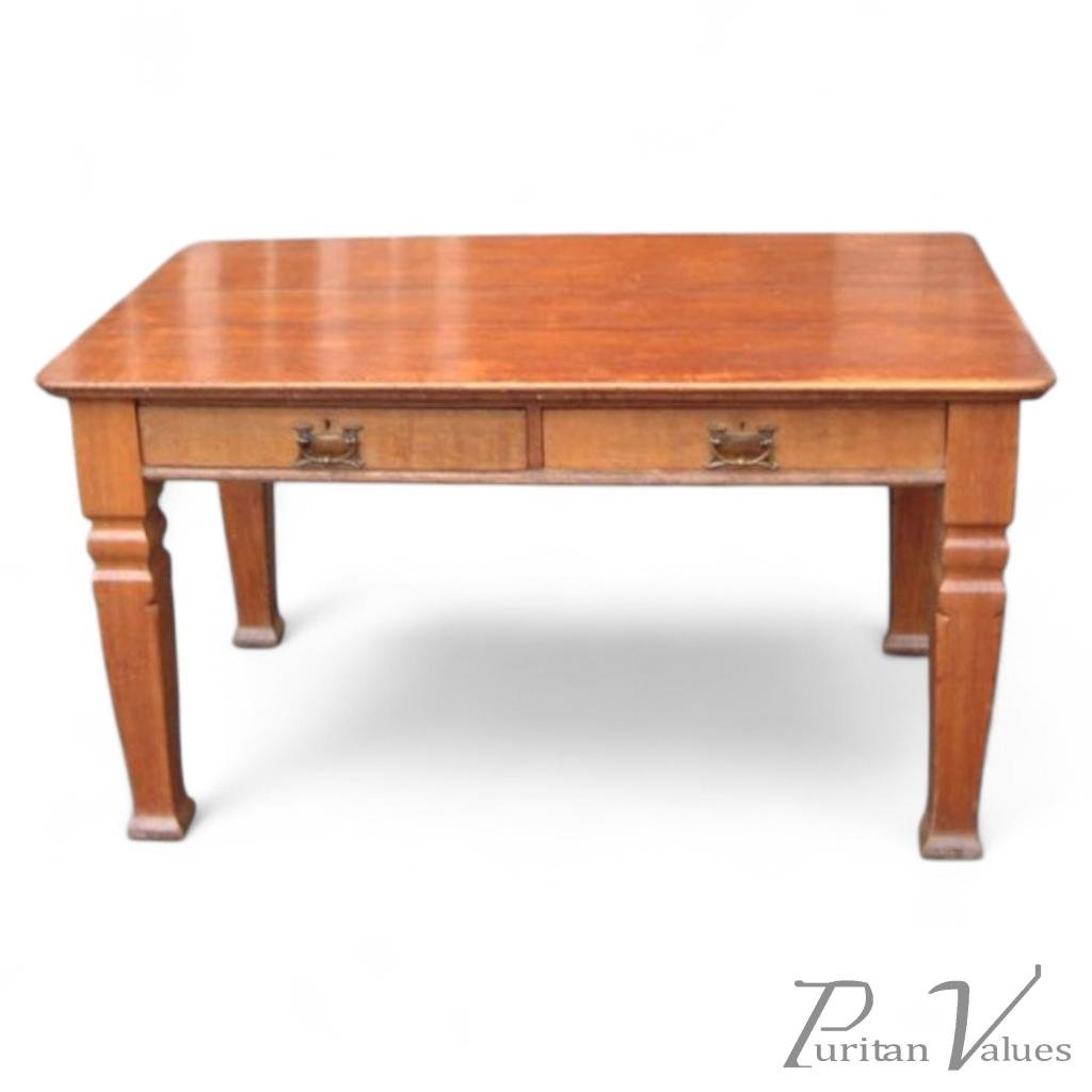 A very good quality Arts and Crafts oak two drawer desk of generous proportions with good quality Arts and Crafts handles with entwined drops.
