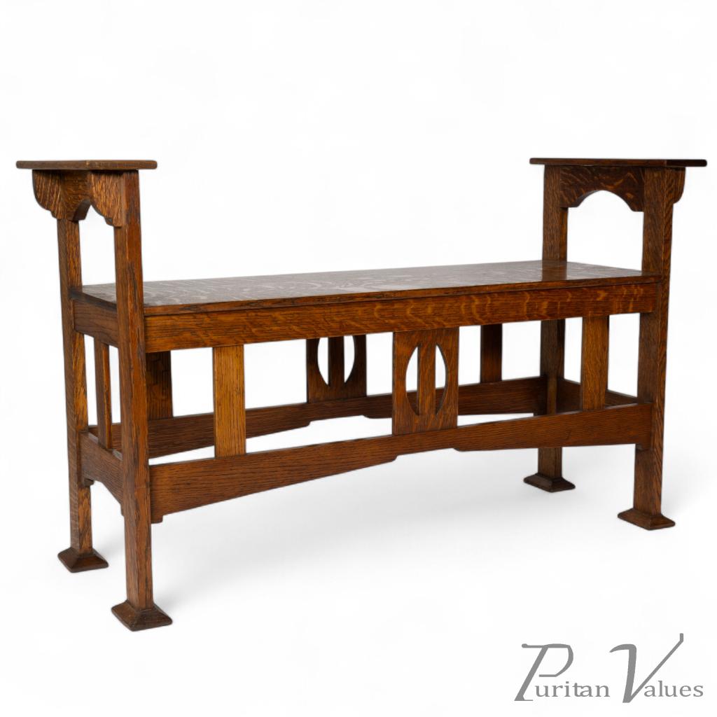England. An Arts and Crafts oak double piano stool, window, or duet seat with stylized details throughout.