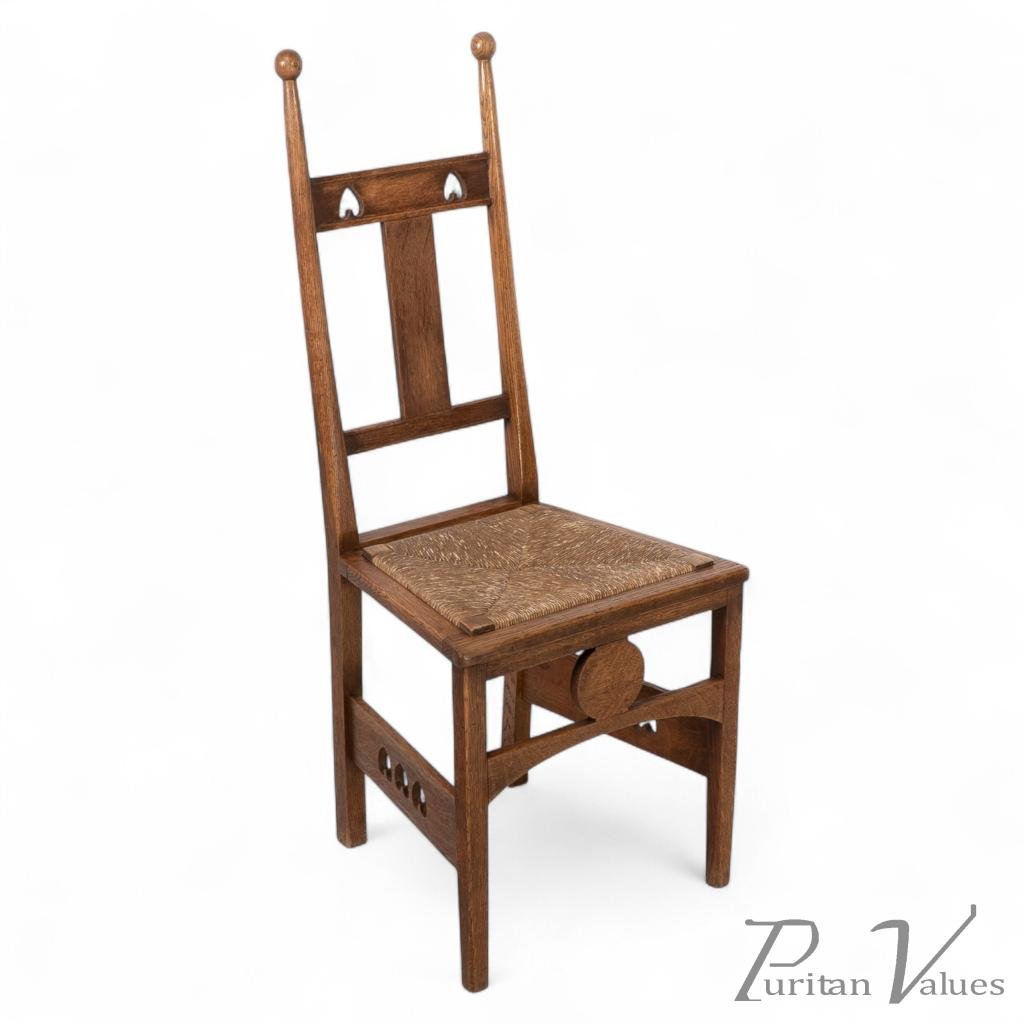 An Arts and Crafts oak desk or side chair with ball finials and pierced hearts to the head rest and to the wide side stretchers, with a circular motif to the front stretcher and the original rush seat.