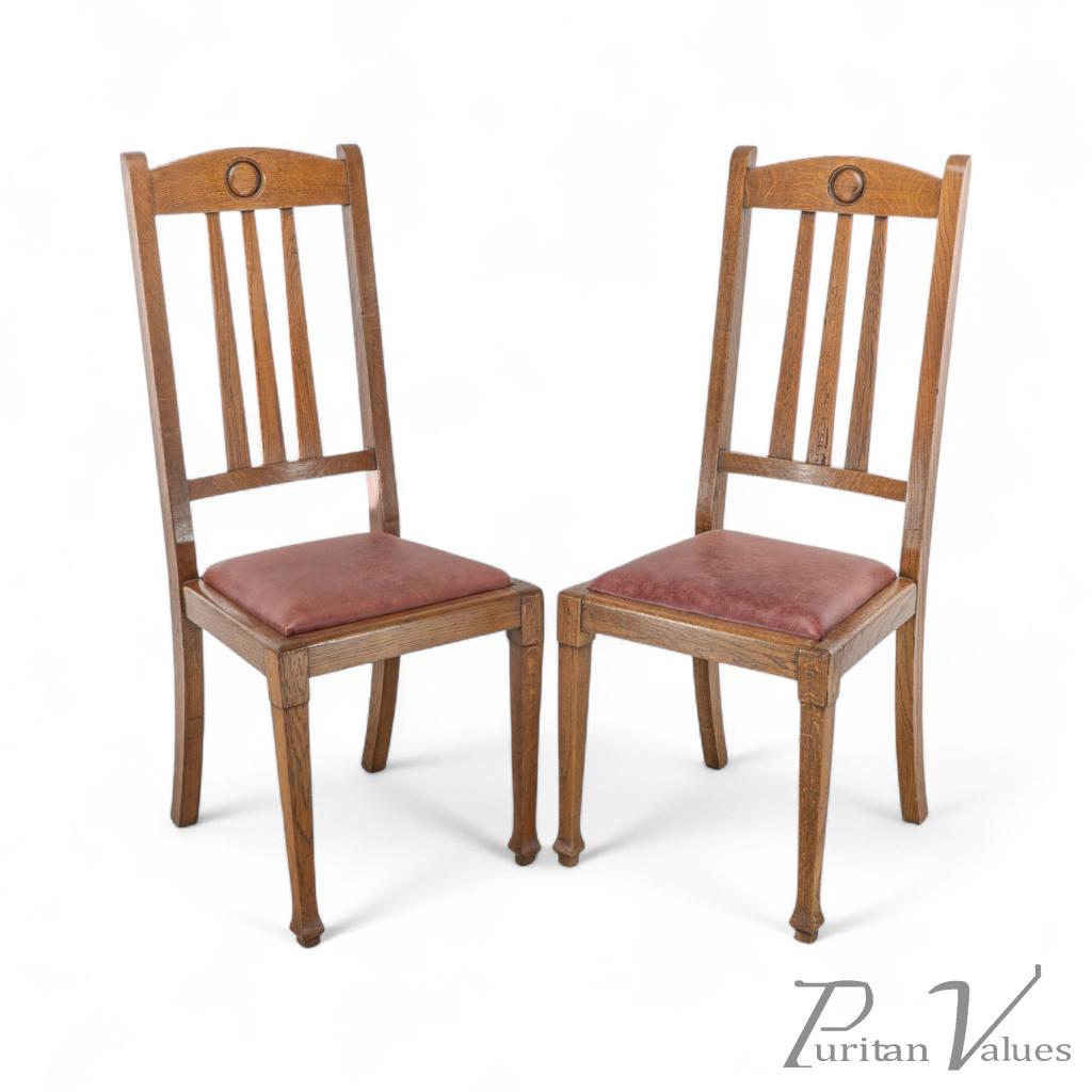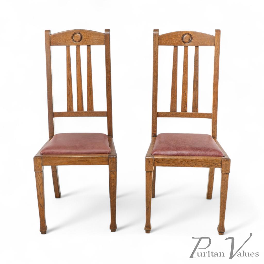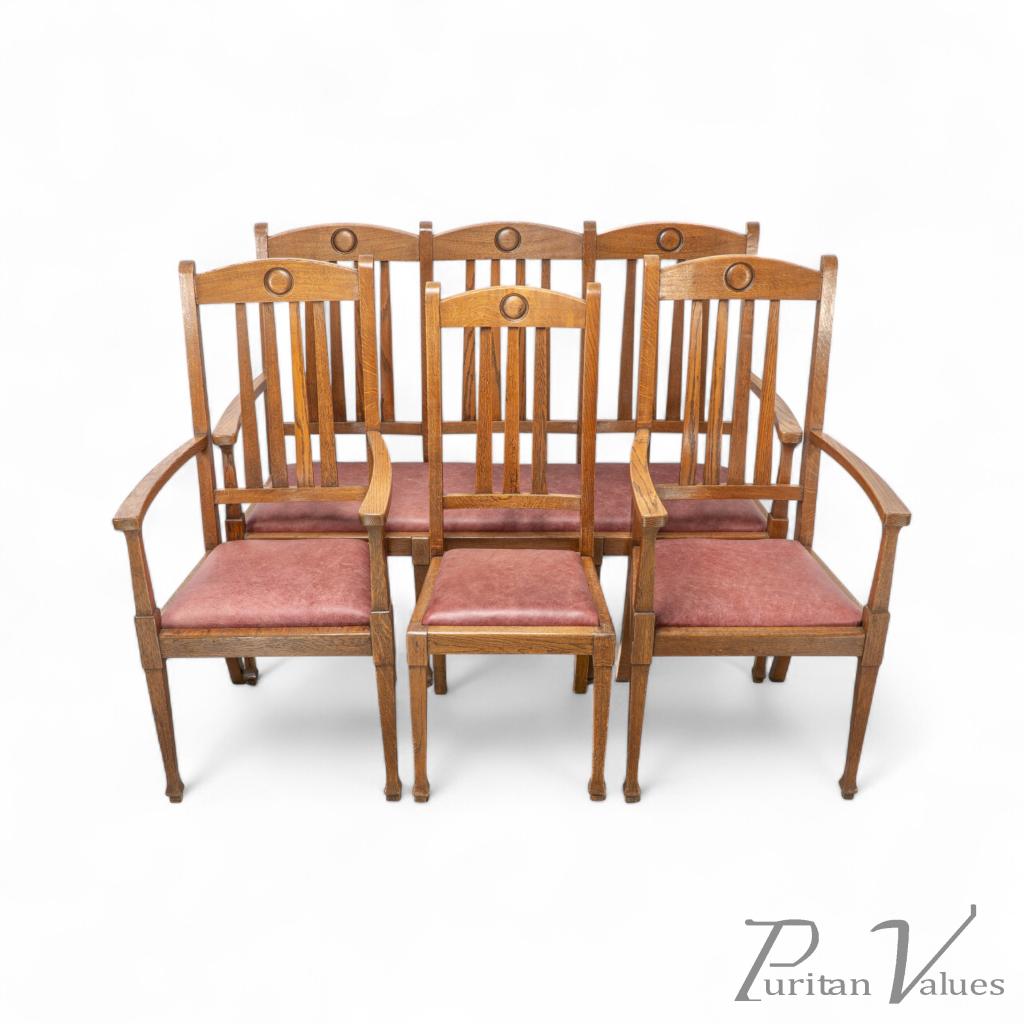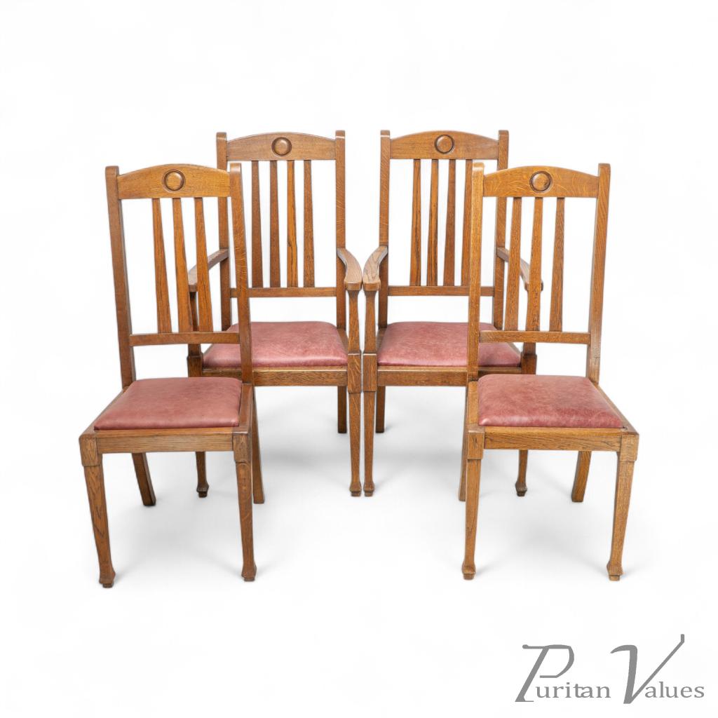 A quality suite of ten Arts & Crafts oak dining chairs with a rare three seat model with carved roundel to the head rests. These have all been gently knocked apart, joints cleaned, glued, reassembled and clamped, cleaned and waxed, and have been professionally reupholstered in a quality leather.