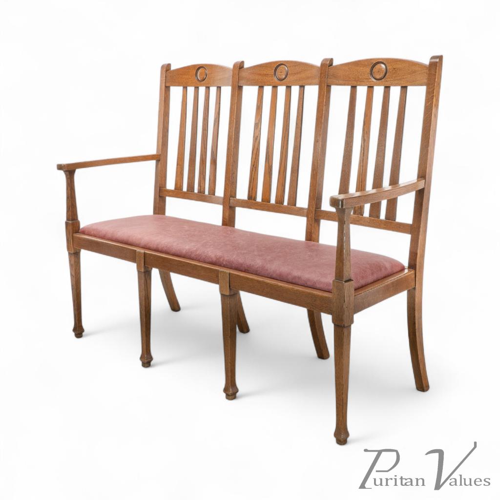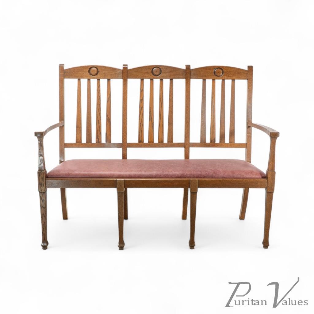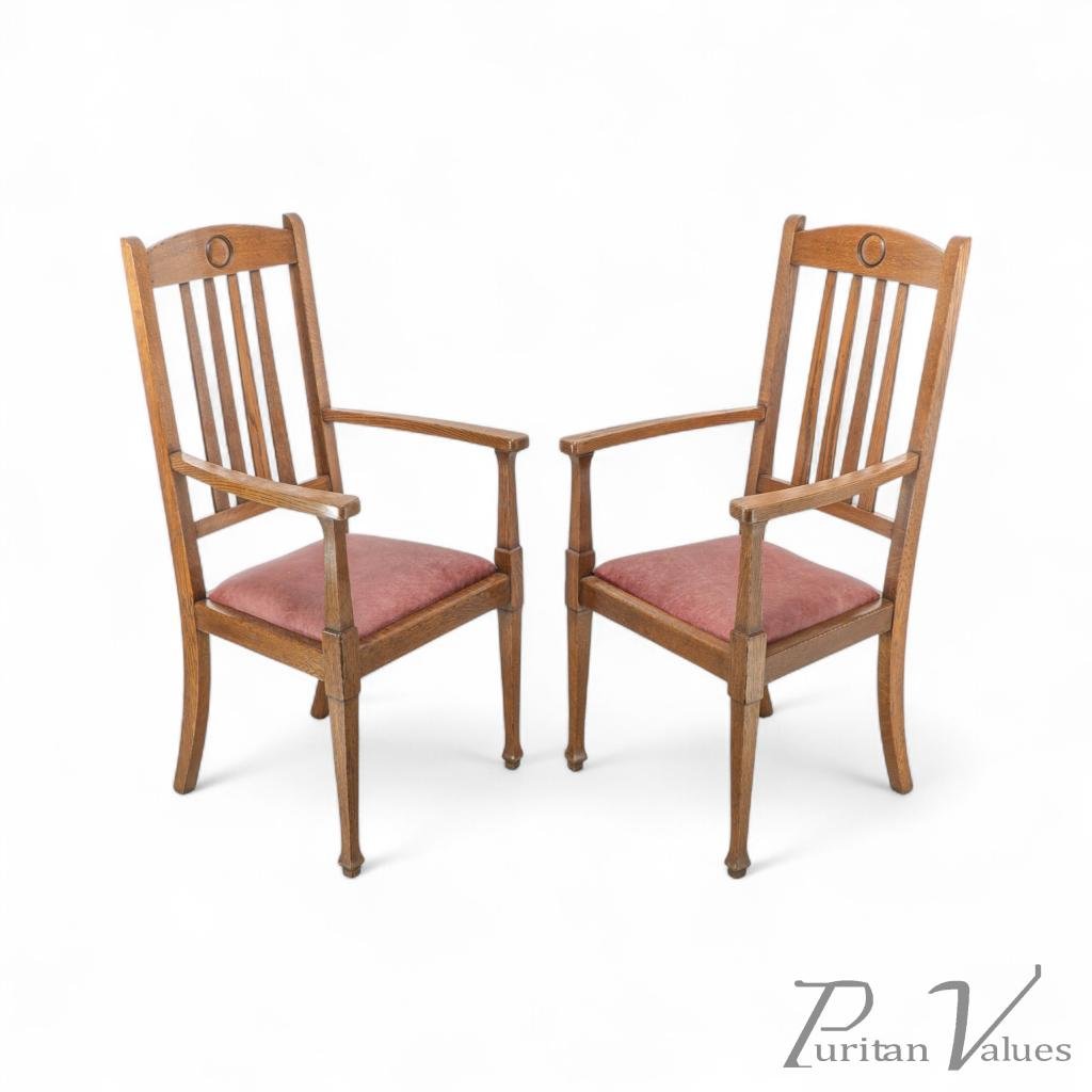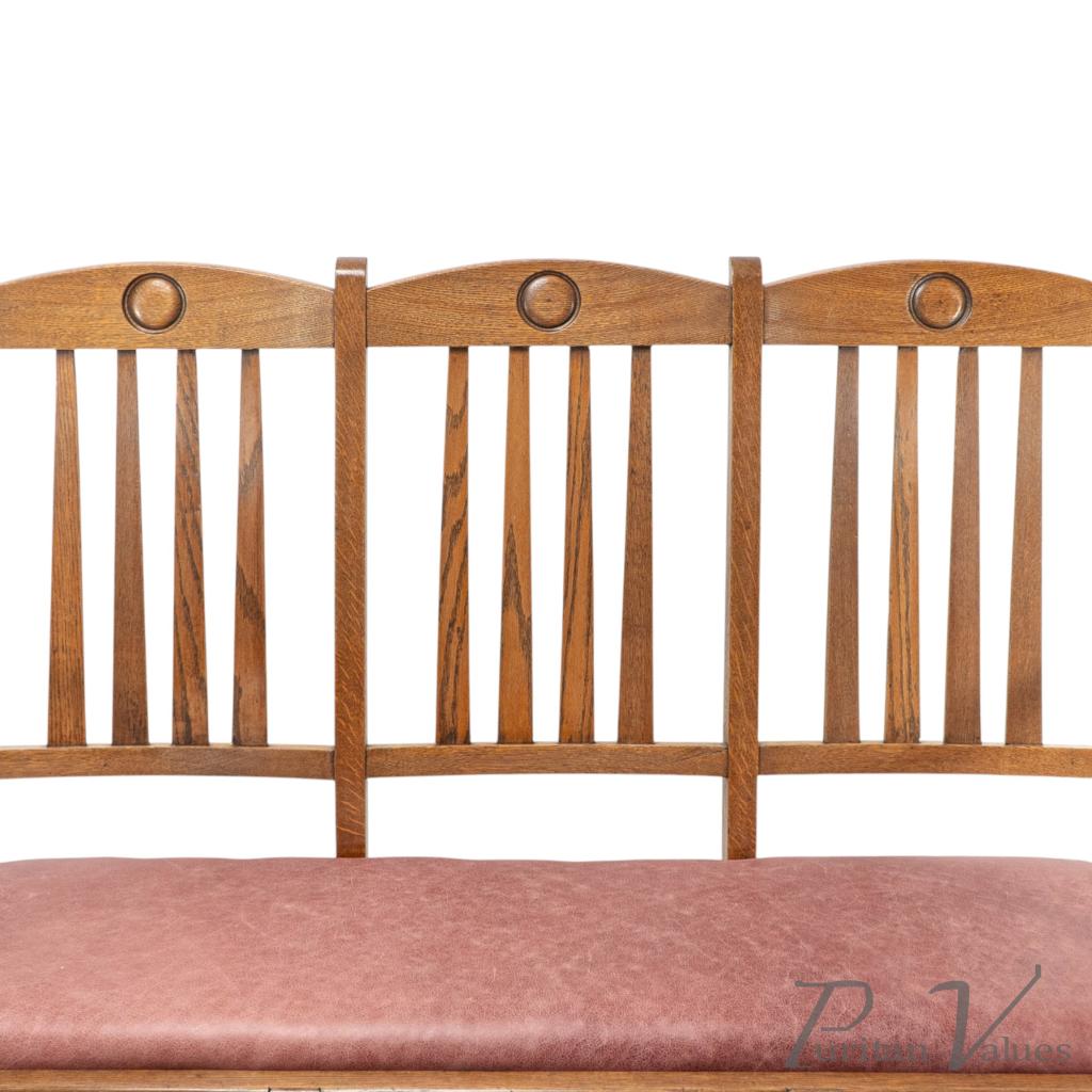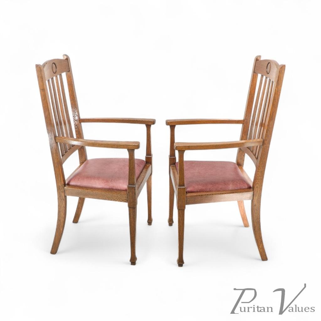 A quality suite of ten Arts & Crafts oak dining chairs with a rare three seat model with carved roundel to the head rests. These have all been gently knocked apart, joints cleaned, glued, reassembled and clamped, cleaned and waxed, and have been professionally reupholstered in a quality leather.