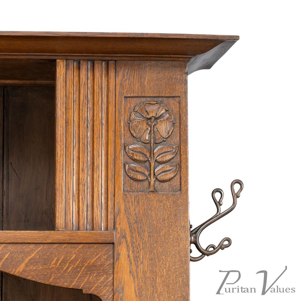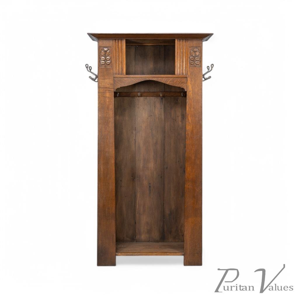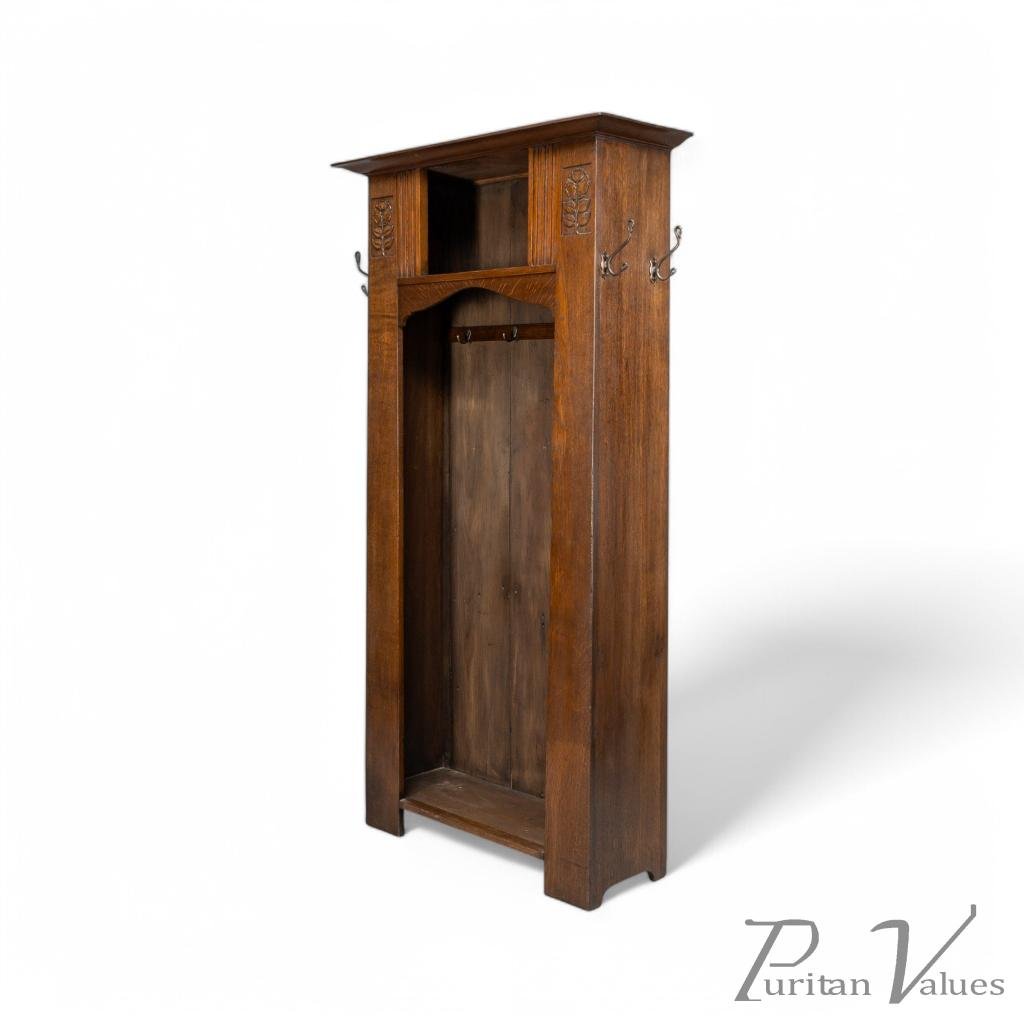 An Arts & Crafts oak hall cupboard in the style of M. H. Baillie Scott, of tapering architectural form. The flaring cornice with an open upper hat cupboard, flanked by stylized floral carvings. The open hanging coat space has brass coat hooks to the back and has a slender rail to the inner top where you can hang a decorative curtain. Boot and shoe storage space to the base.