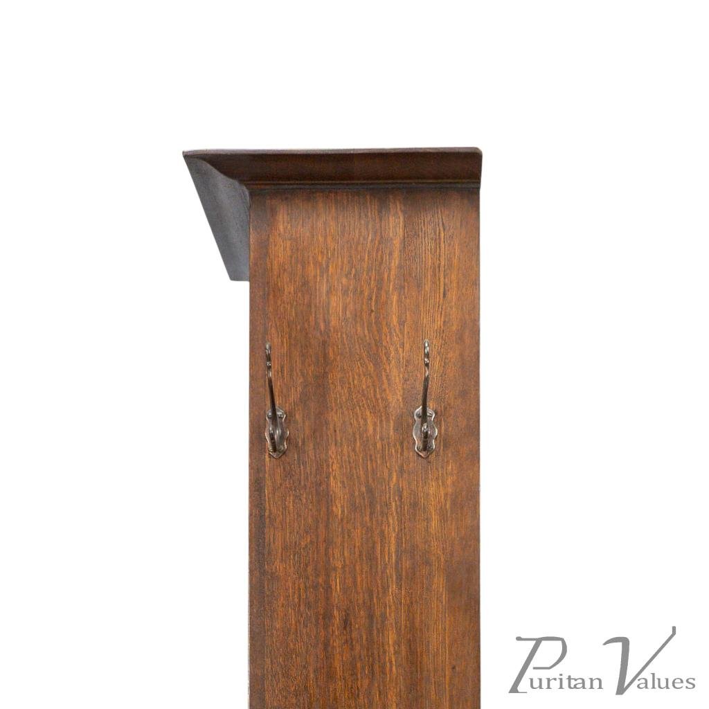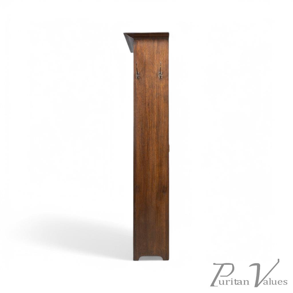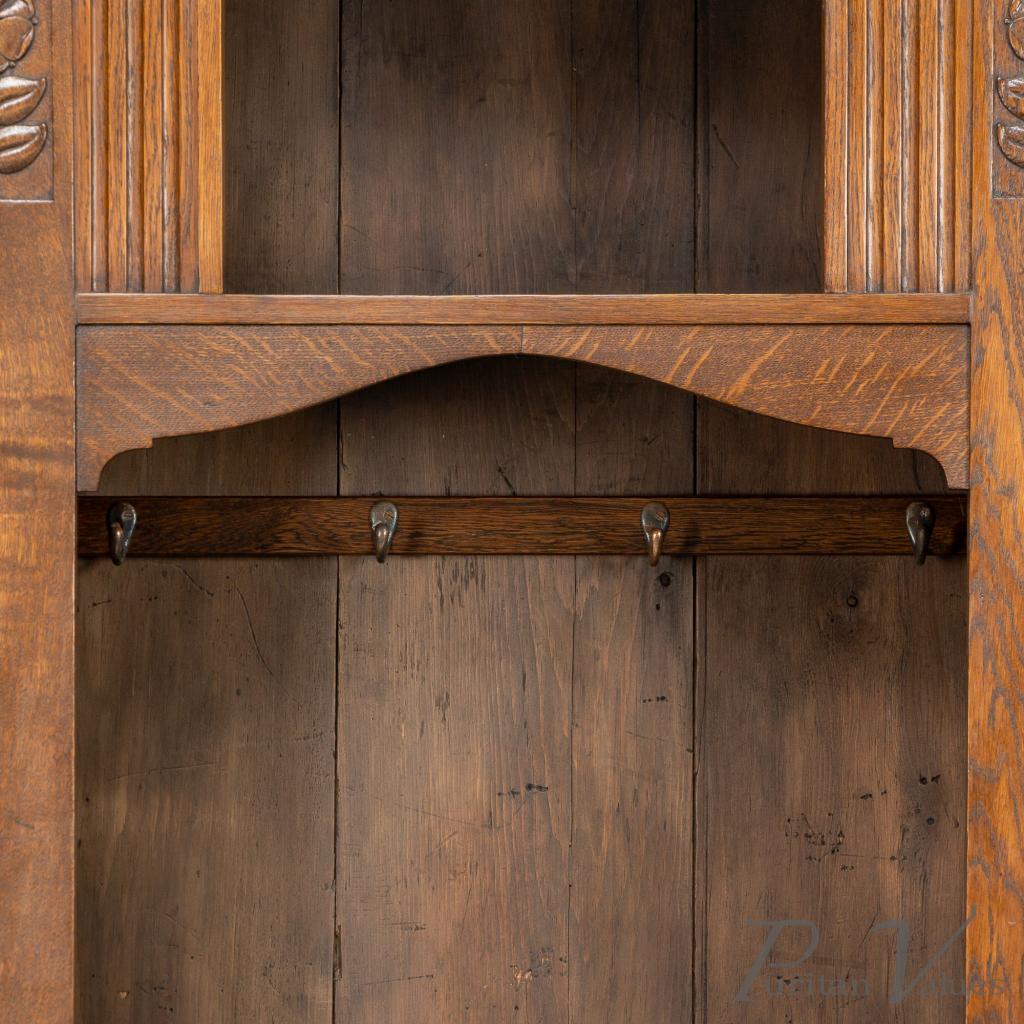 An Arts & Crafts oak hall cupboard in the style of M. H. Baillie Scott, of tapering architectural form. The flaring cornice with an open upper hat cupboard, flanked by stylized floral carvings. The open hanging coat space has brass coat hooks to the back and has a slender rail to the inner top where you can hang a decorative curtain. Boot and shoe storage space to the base.