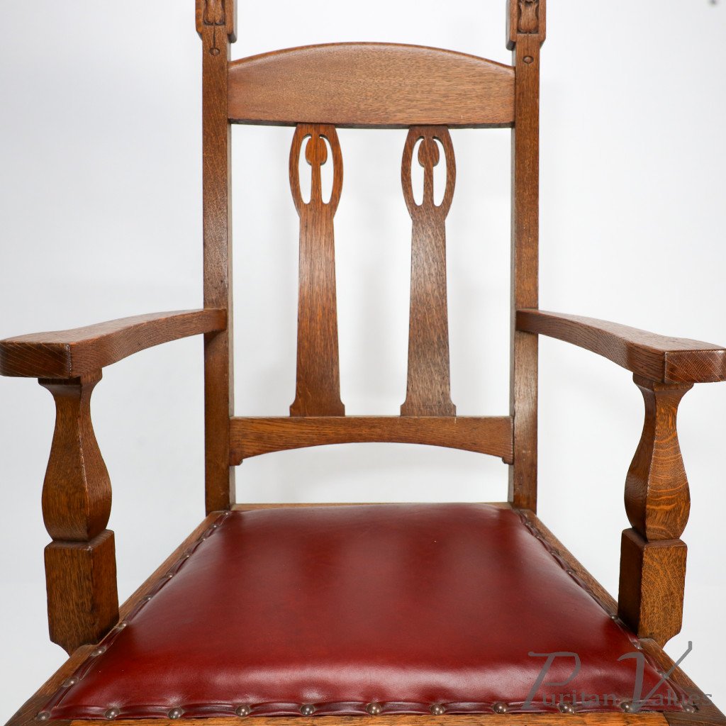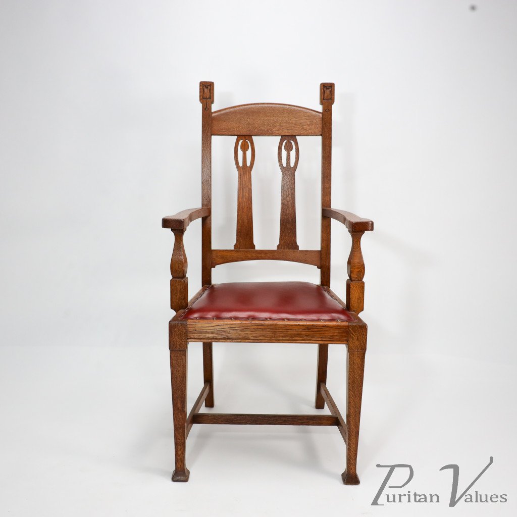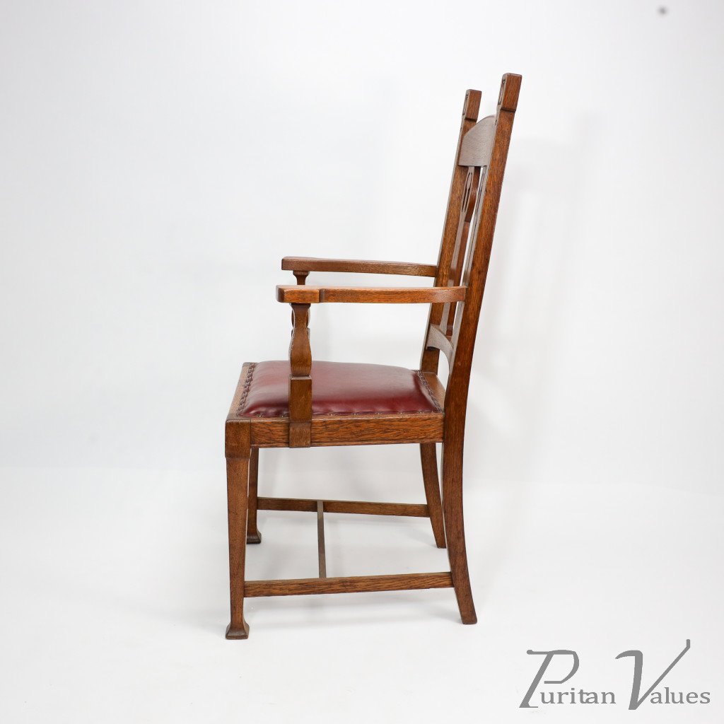 A substantial and solid Arts and Crafts oak armchair with stylized floral cut-outs to the top extended uprights.