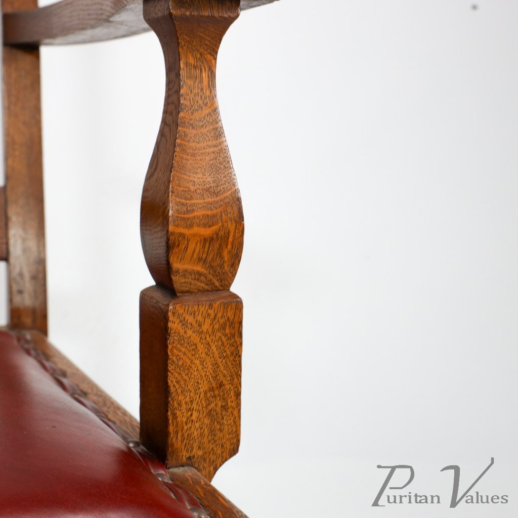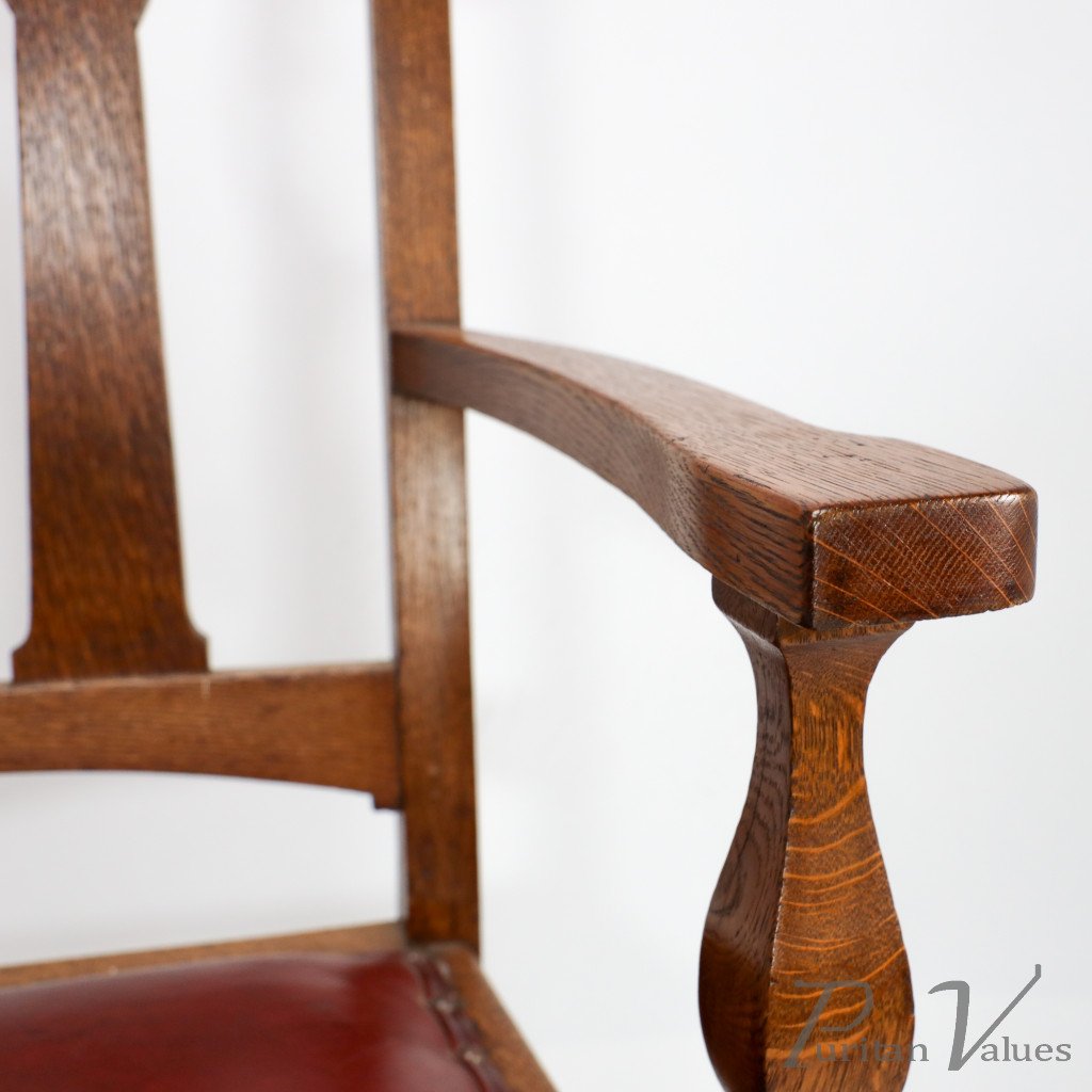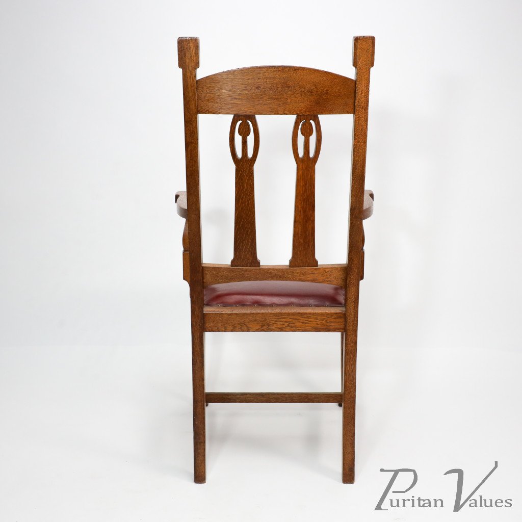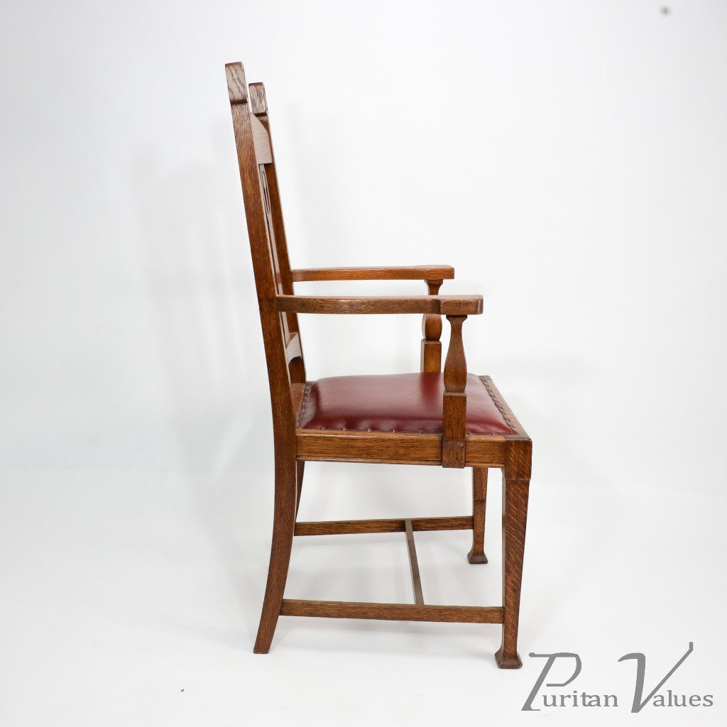 A substantial and solid Arts and Crafts oak armchair with stylized floral cut-outs to the top extended uprights.