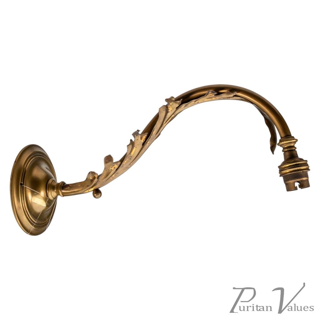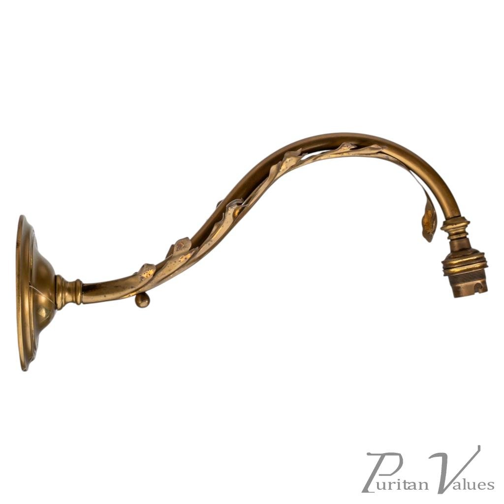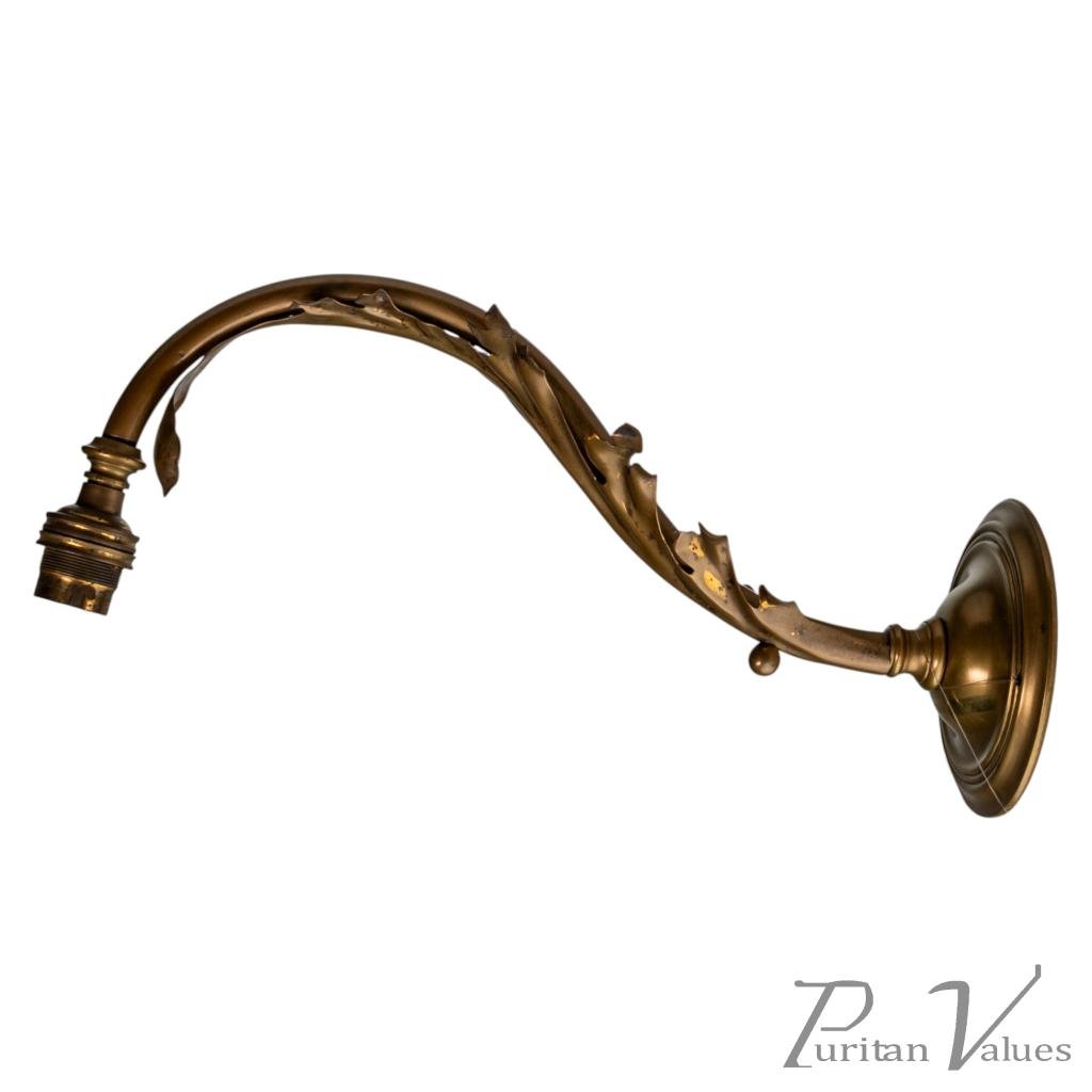 Single brass wall light, aligned to the Arts and Crafts movement (1880–1910), c.1905. Curved arm rises from a round, stepped backplate with a stylised leaf mount, the brass now polished. Compact proportions and a generous projection make it ideal beside a mirror or as a reading light.