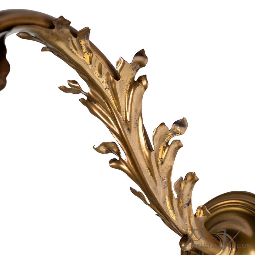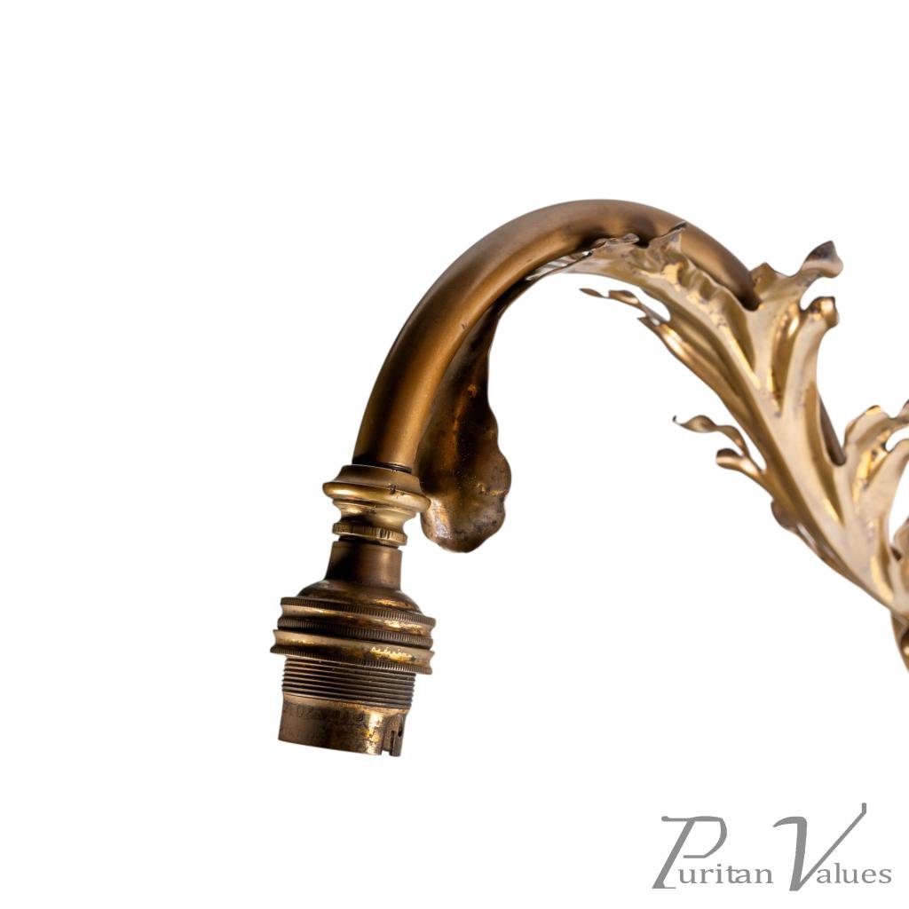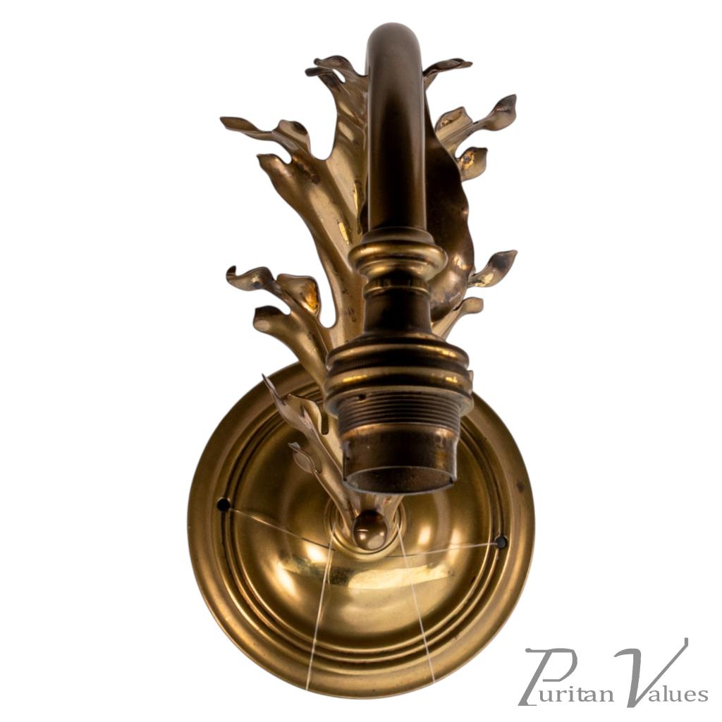 Single brass wall light, aligned to the Arts and Crafts movement (1880–1910), c.1905. Curved arm rises from a round, stepped backplate with a stylised leaf mount, the brass now polished. Compact proportions and a generous projection make it ideal beside a mirror or as a reading light.