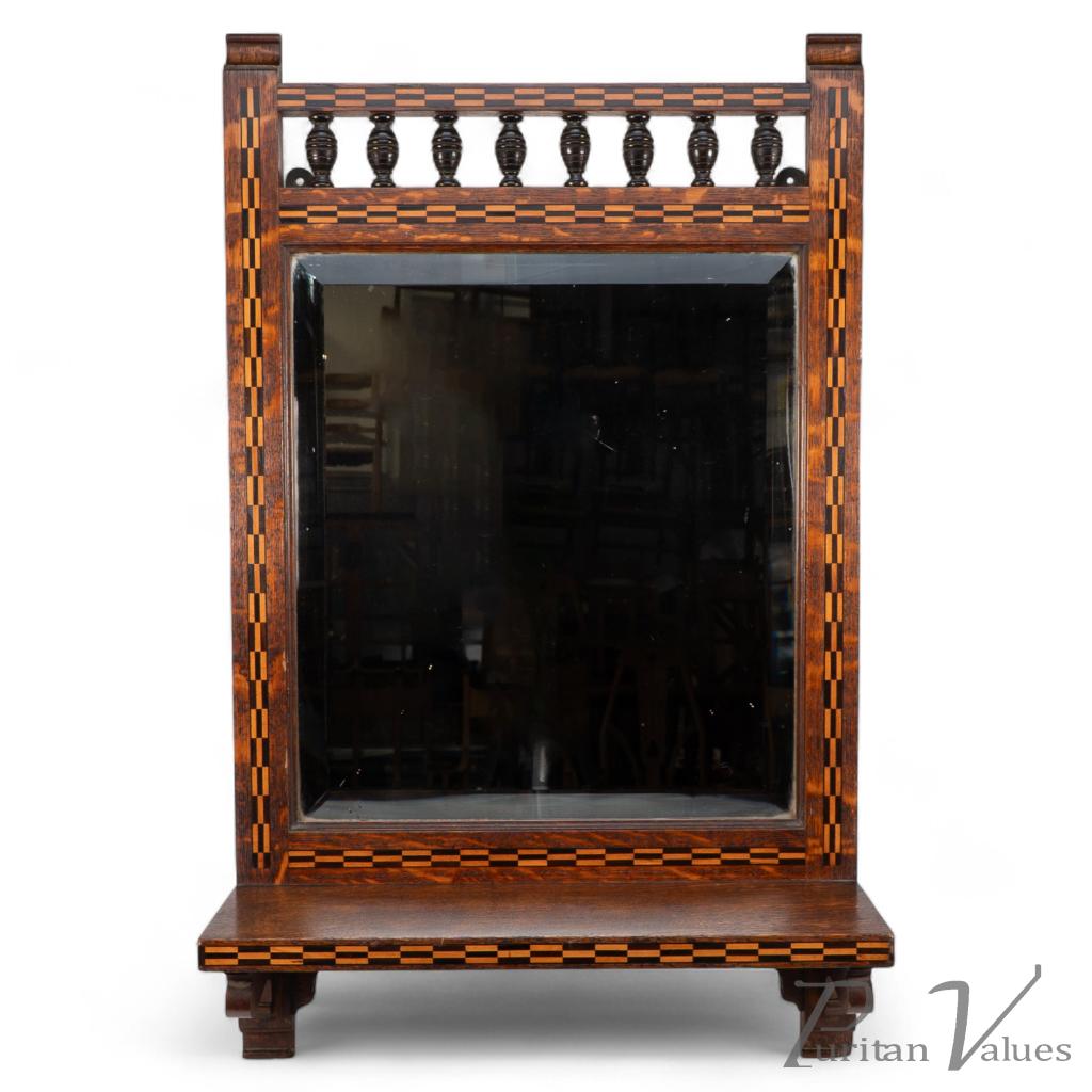 Shapland and Petter attributed. In the style of M H Baillie Scott an Arts & Crafts oak mirror with chequer inlays of ebony and box wood with a lower shelf and shaped supports, Scroll finials and ebonised turnings to the top.