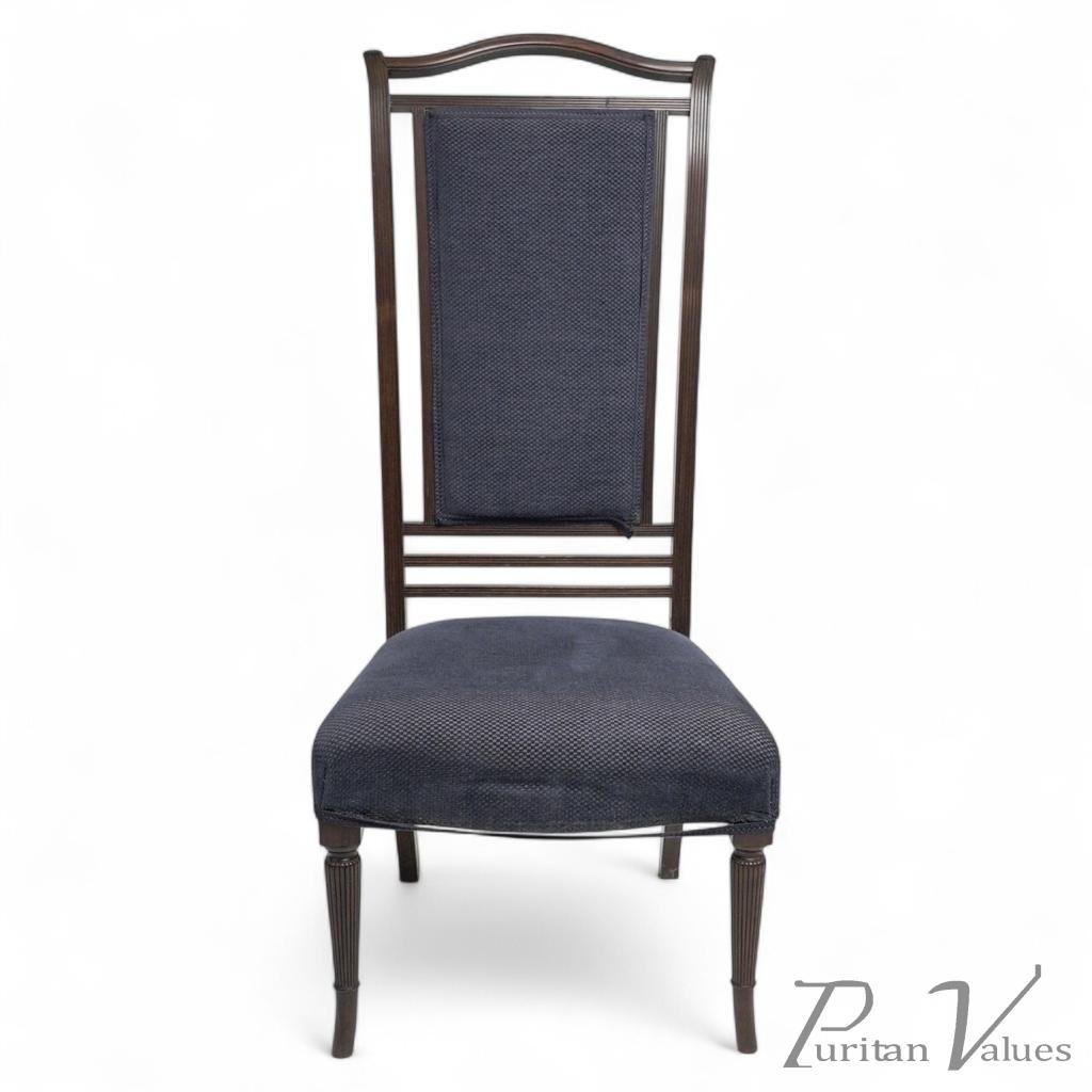 High-back chair in rosewood designed by Thomas Edward Collcutt for Collinson and Lock during the Aesthetic Movement (1860–1890), c.1880. The frame is composed with elegant architectural precision, the tapering front legs and rectangular back united by linear stretchers and an upholstered panel that accentuates the chair’s upright silhouette. The later blue fabric complements the original rosewood tone without disturbing the period form.