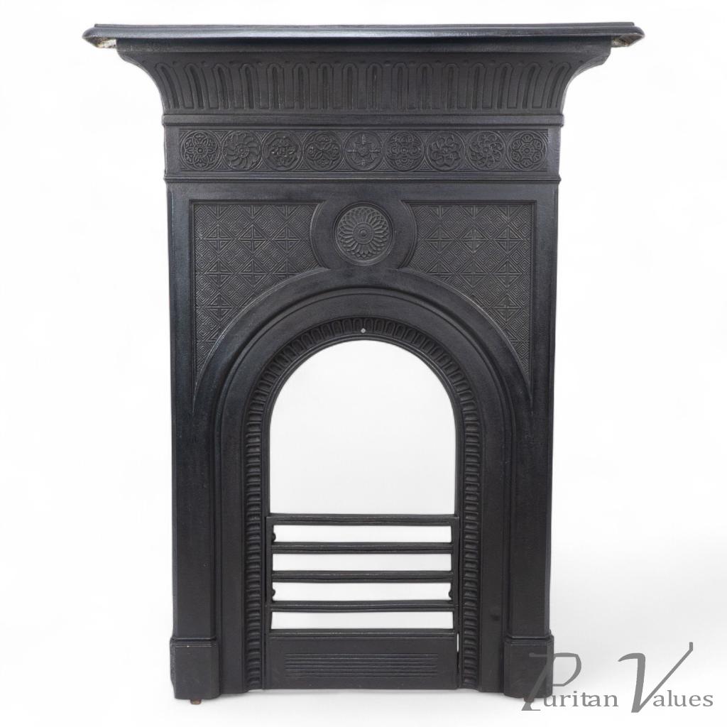 A rare Aesthetic Movement fireplace with a curvaceous mantle with gadrooned and dot details and a row of Japanese floral insignias. The centre one is decorated with Barnard, Bishop & Barnard's trademark four opposing bees with a larger sunflower below, flanked by Japanese designs stretching down to unite with the arched opening, complete with its bars.