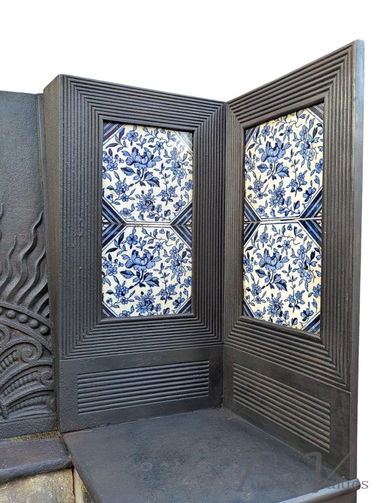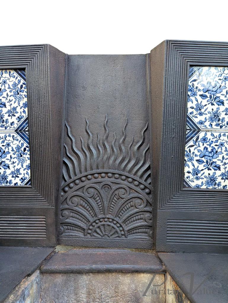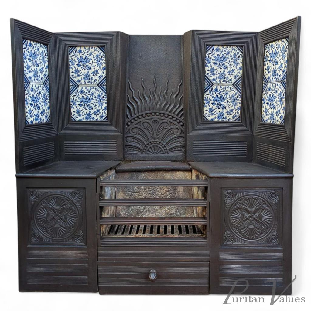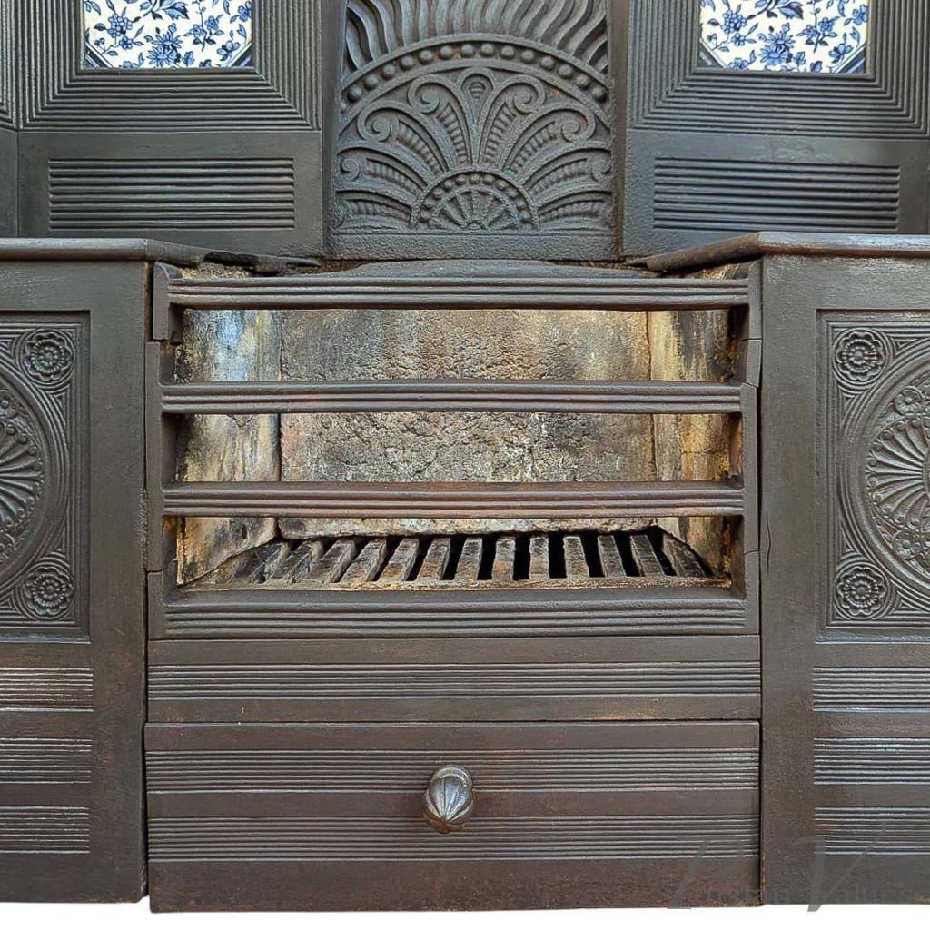 Thomas Jeckyll for Barnard Bishop & Barnard. An original Aesthetic Movement cast iron fireplace. The centre has a radiating decoration reminiscent of Jeckyll's cast iron garden bench design but with flames licking above, and flanked by the original Aesthetic blue tiles framed with tramline details. The original ash pan to the bottom centre has the known Jeckyll flower bud handle with conforming tramline details.