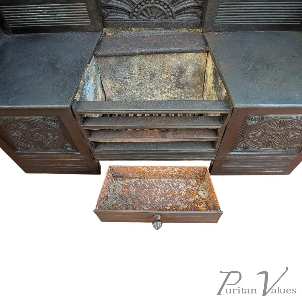 Each side of the fireplace opening are flat places for a kettle and to roast chestnuts. The lower decorated roundels are identical to a Thomas Jeckyll coal box that we also have available for sale. An image of the coal box and the Barnard Bishop & Barnard period advert with the identical roundels has been added for comparison.