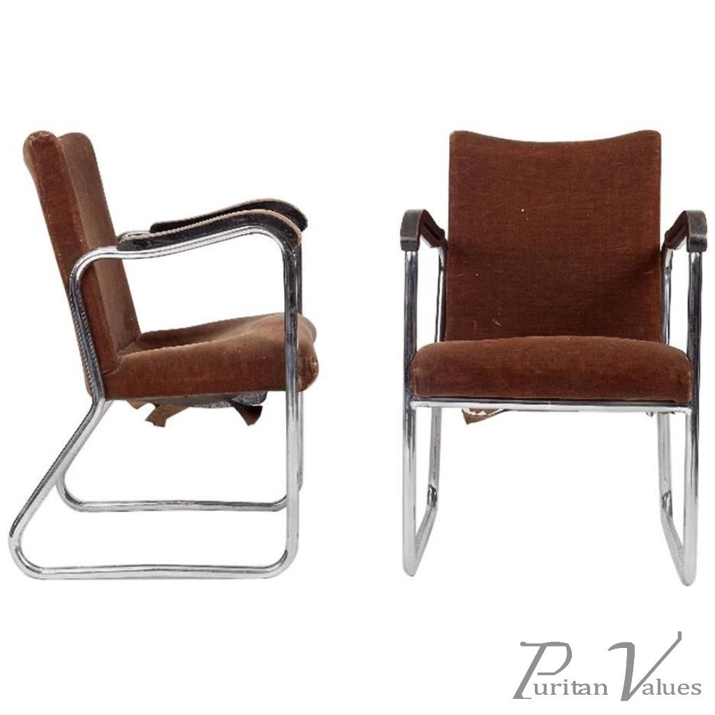 Thonet, an interesting pair of 1930s tubular steel armchairs in the Bauhaus style, each side is one flowing tube, organic shaped arms and conforming ebonized armrests which follow down the legs exaggerating shapes.