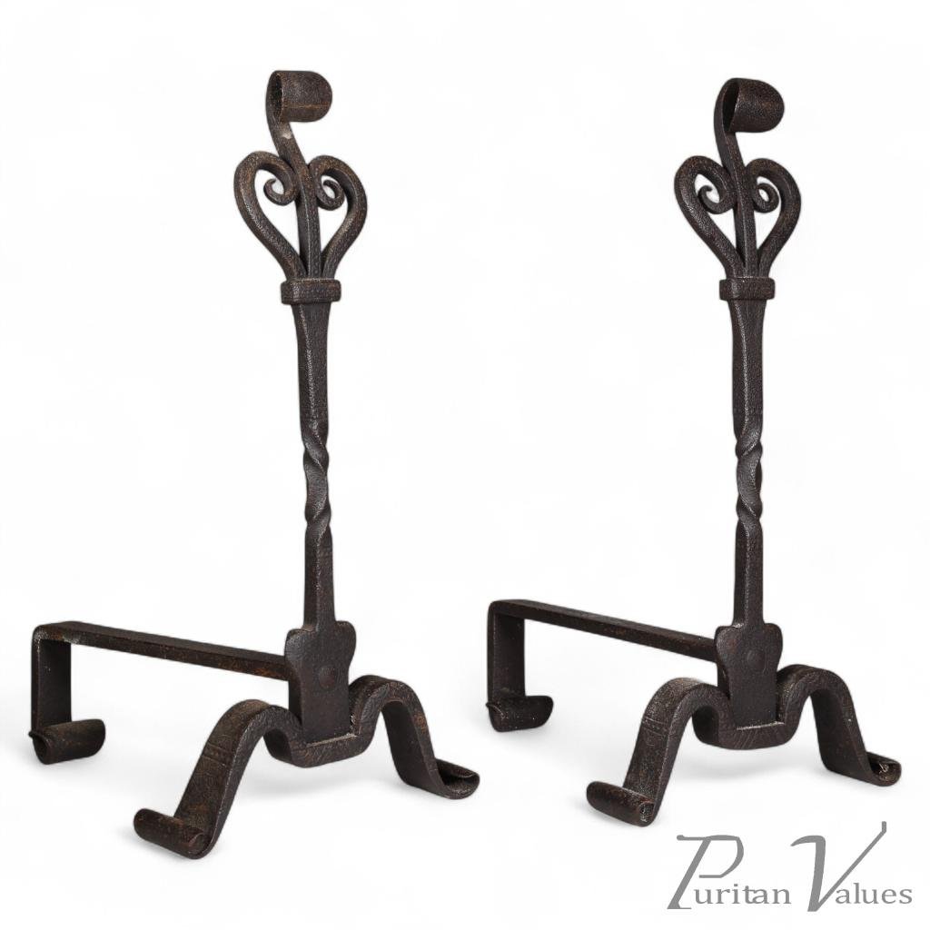 Form and detailing are consistent with Cotswold School metalwork of the period. The scroll tops give a restrained flourish, while the straightforward construction, visible forging and balanced proportions keep the focus on function.