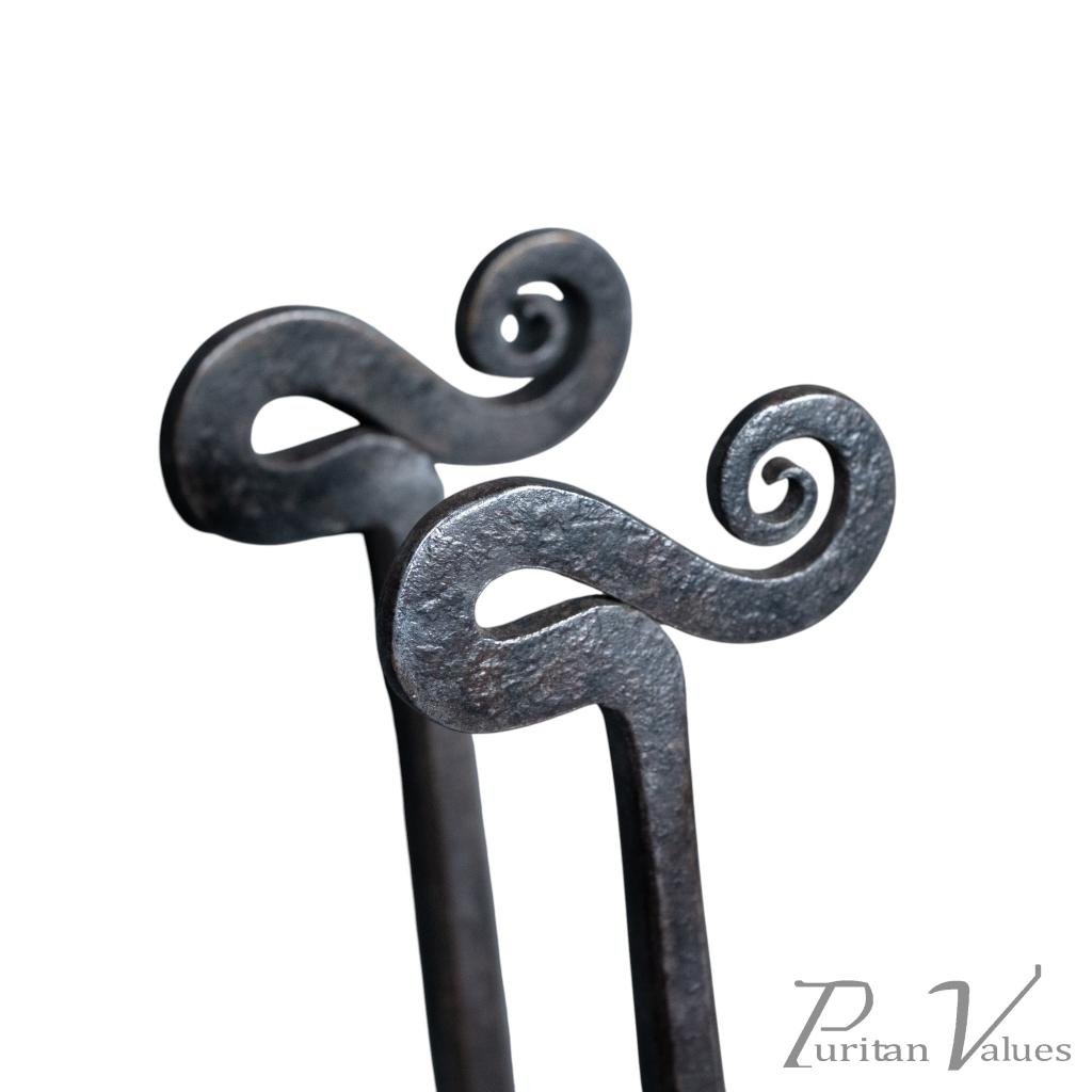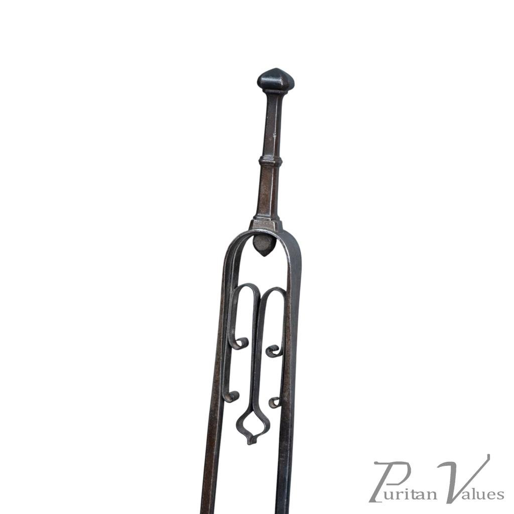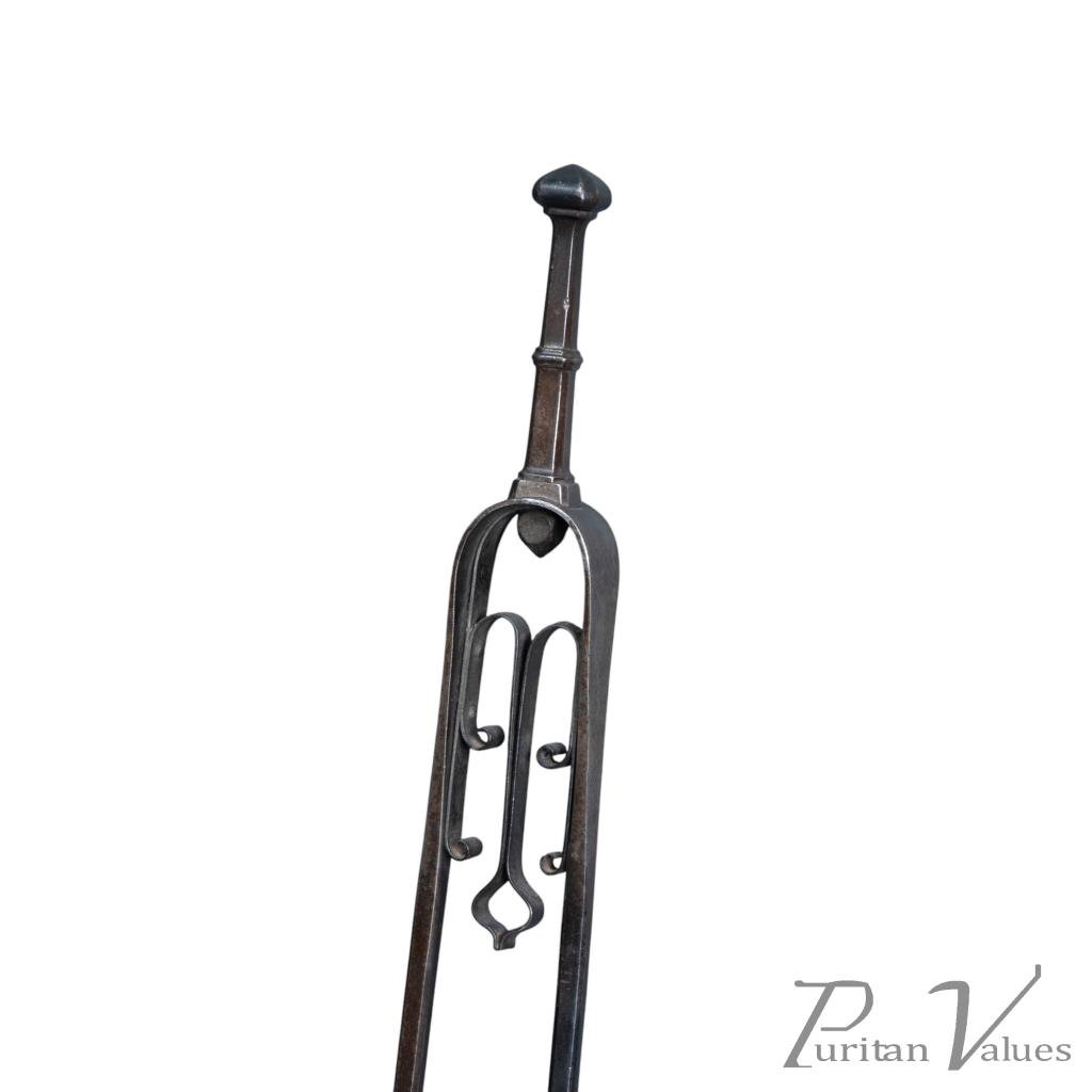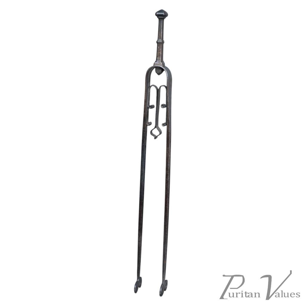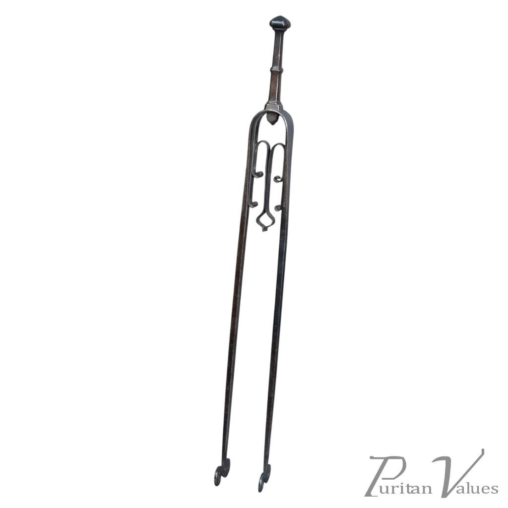 Thornton & Downer, Attributed. Arts and Crafts Cotswold School Hand-Wrought Steel Fire Tongs with Scroll Finials