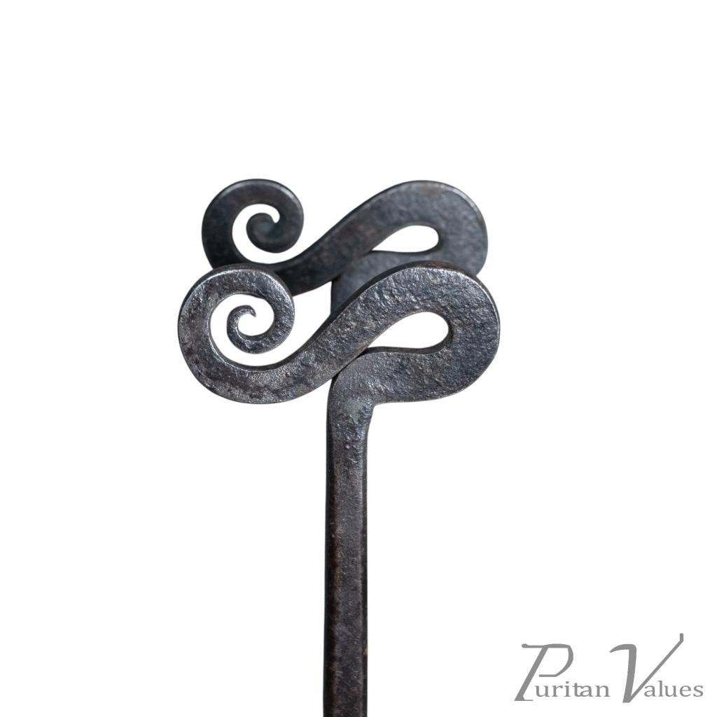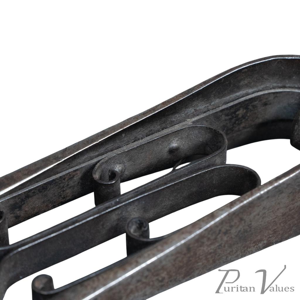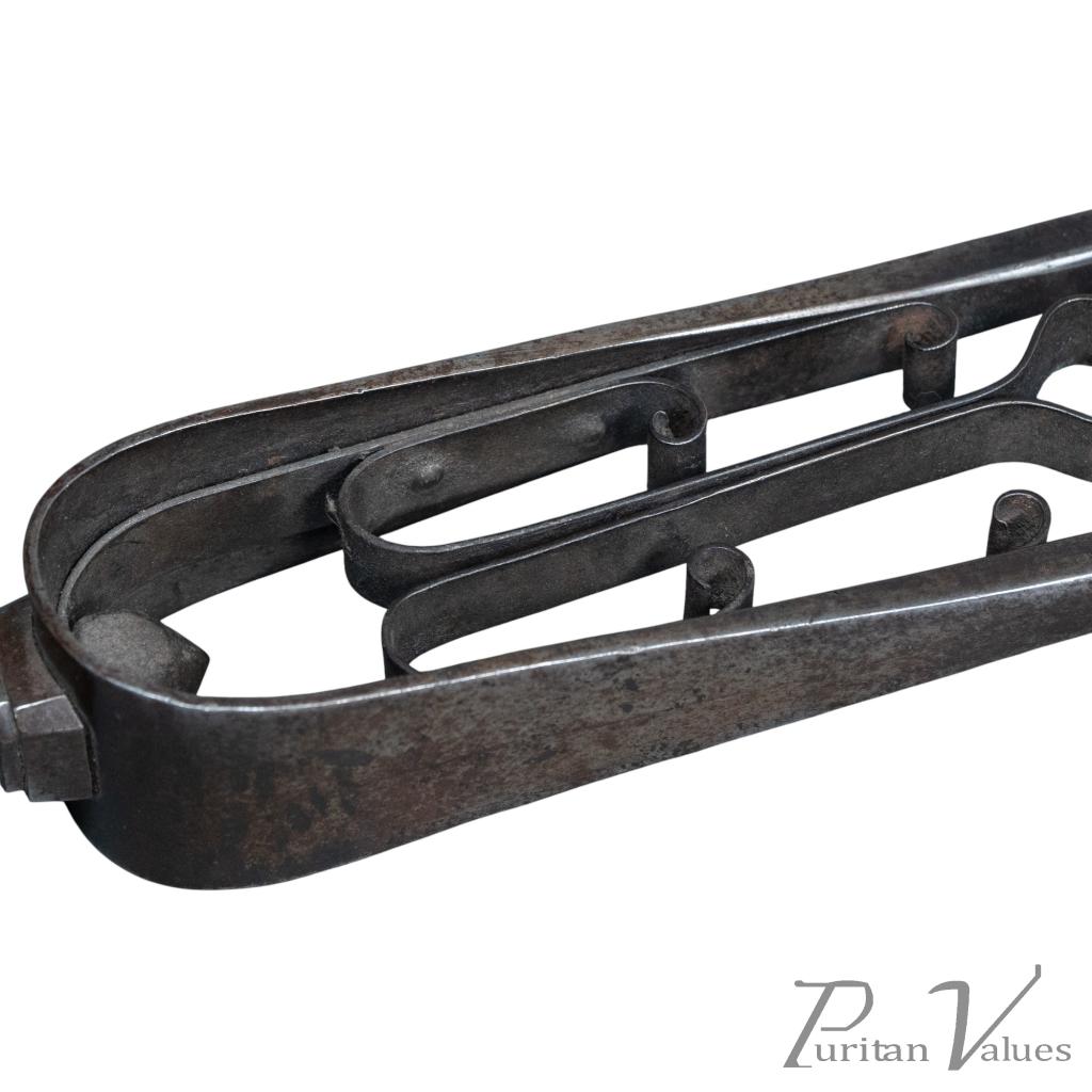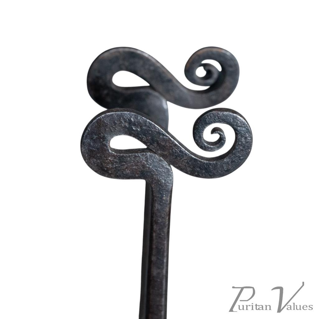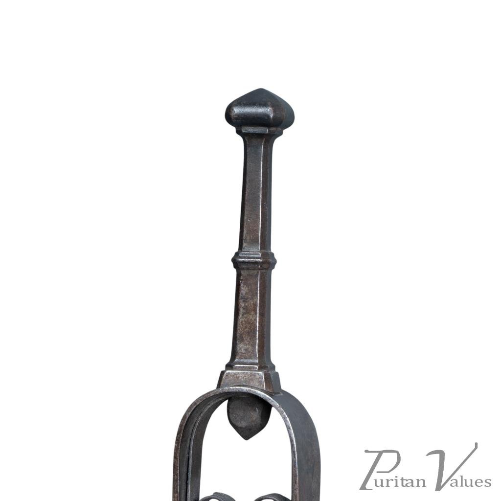 Thornton & Downer, Attributed. Arts and Crafts Cotswold School Hand-Wrought Steel Fire Tongs with Scroll Finials