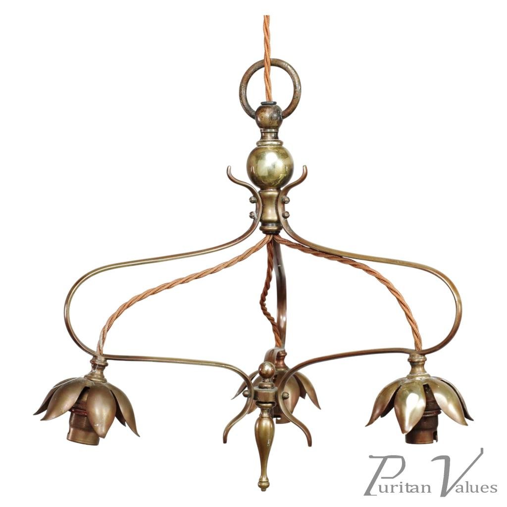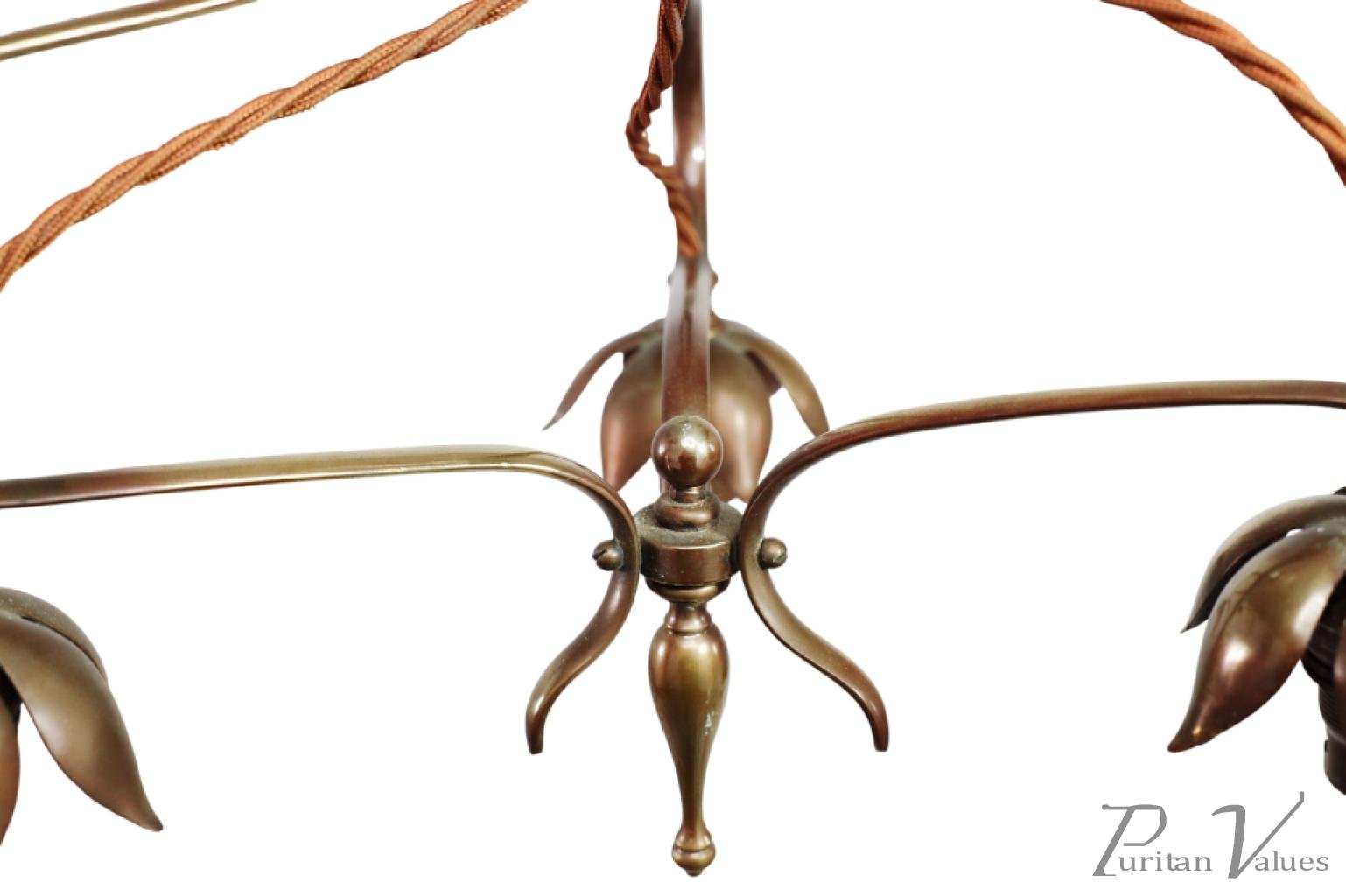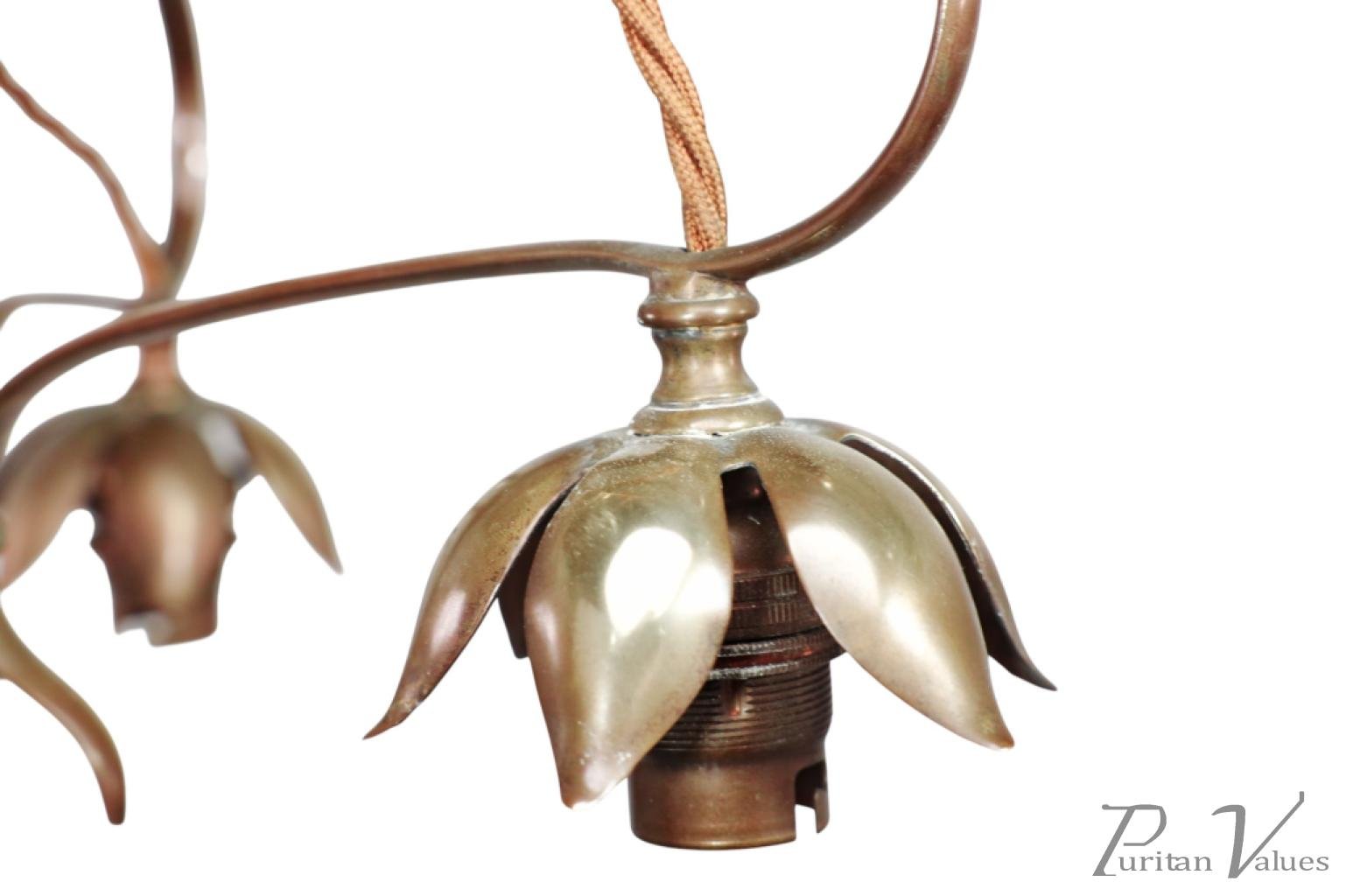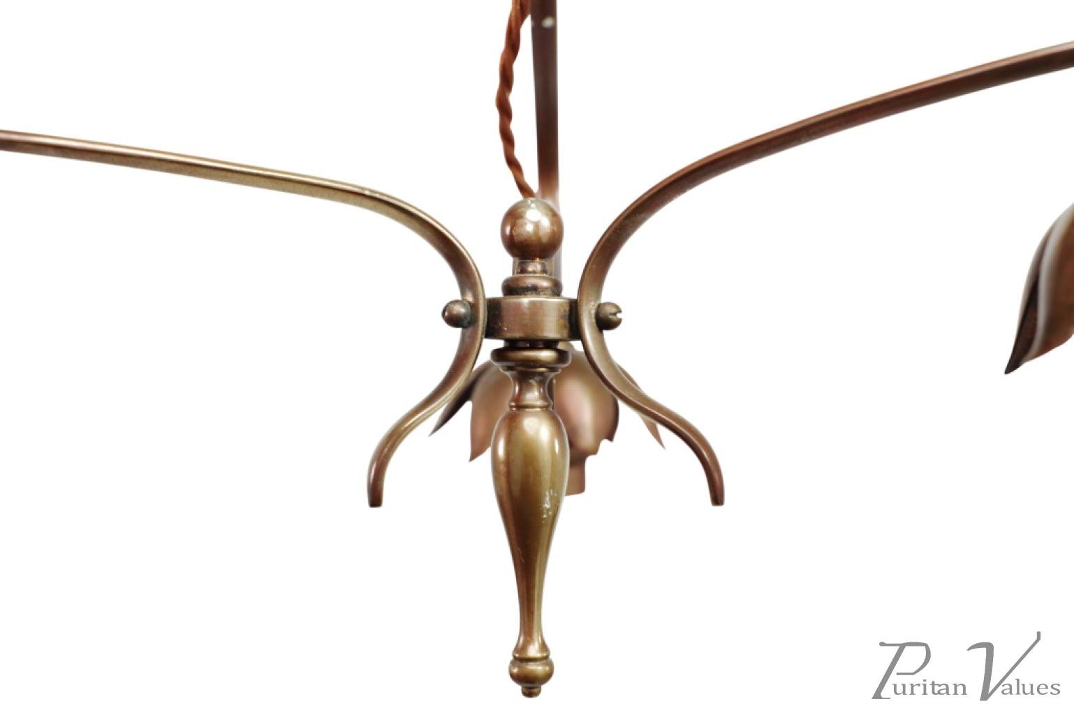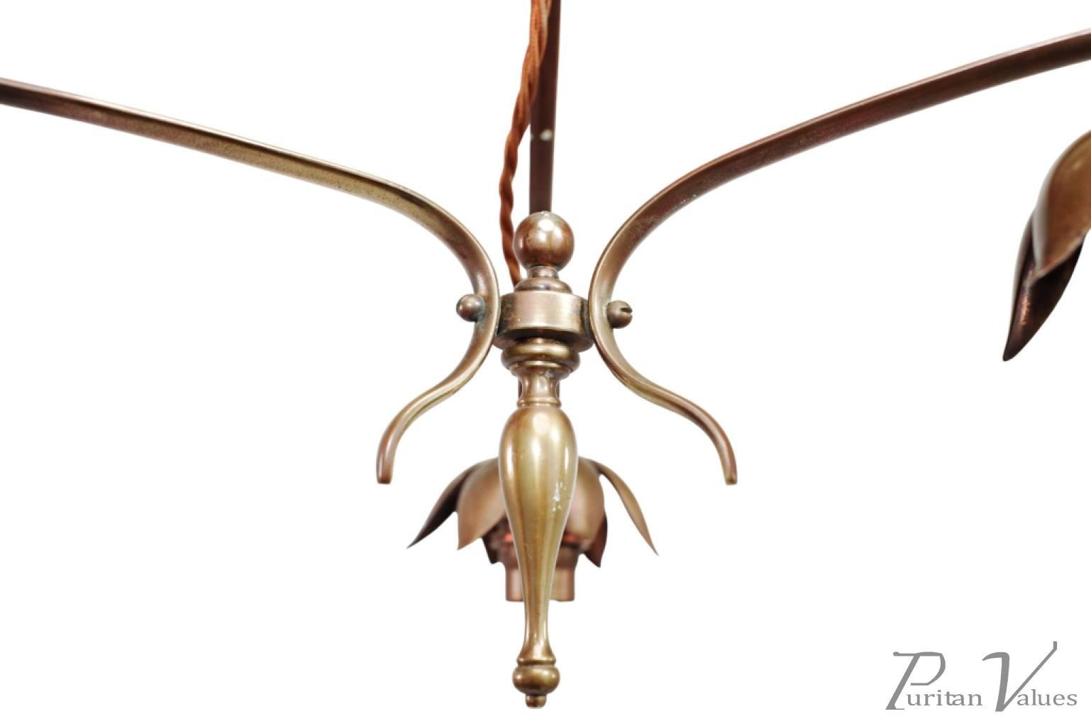 An Arts and Crafts copper and brass three-arm ceiling light with ball and ring hanger and whiplash-style arms that curve back around to the lower central finial at the base, each with copper petal leaves around the bulb holders.