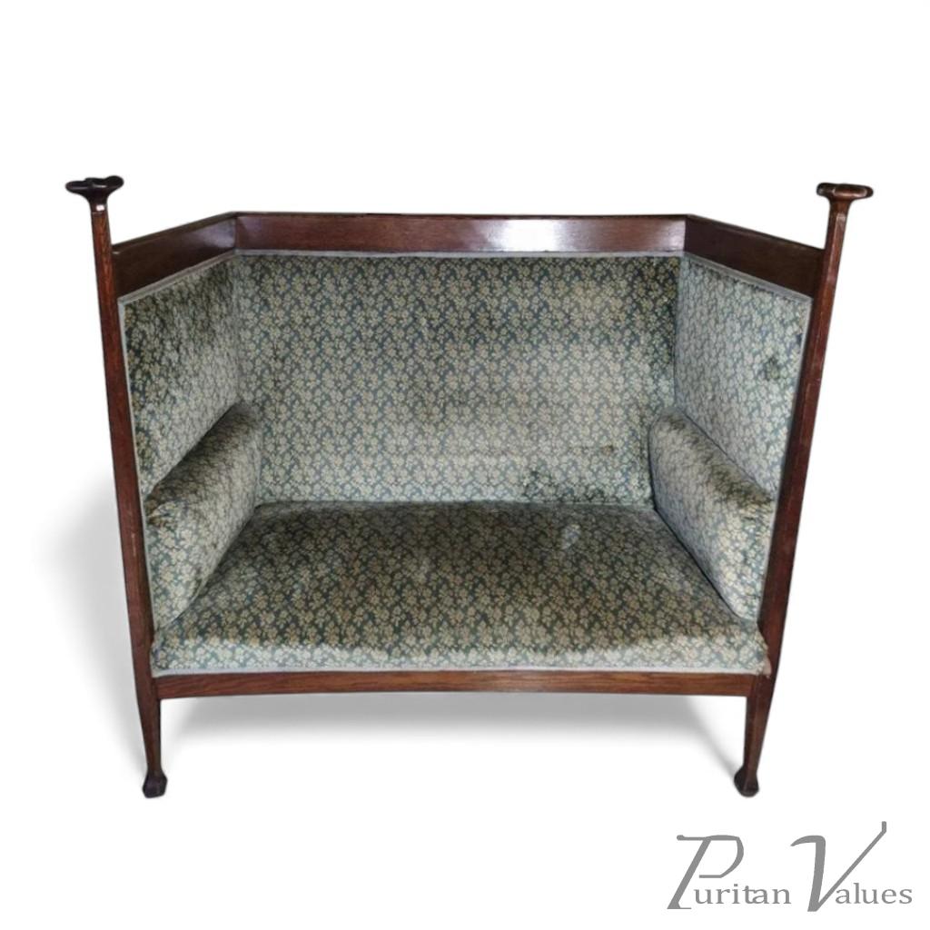 A rare Arts and Crafts exhibition style oak settee or settle with Voysey style uprights to the front with carved flower head caps.