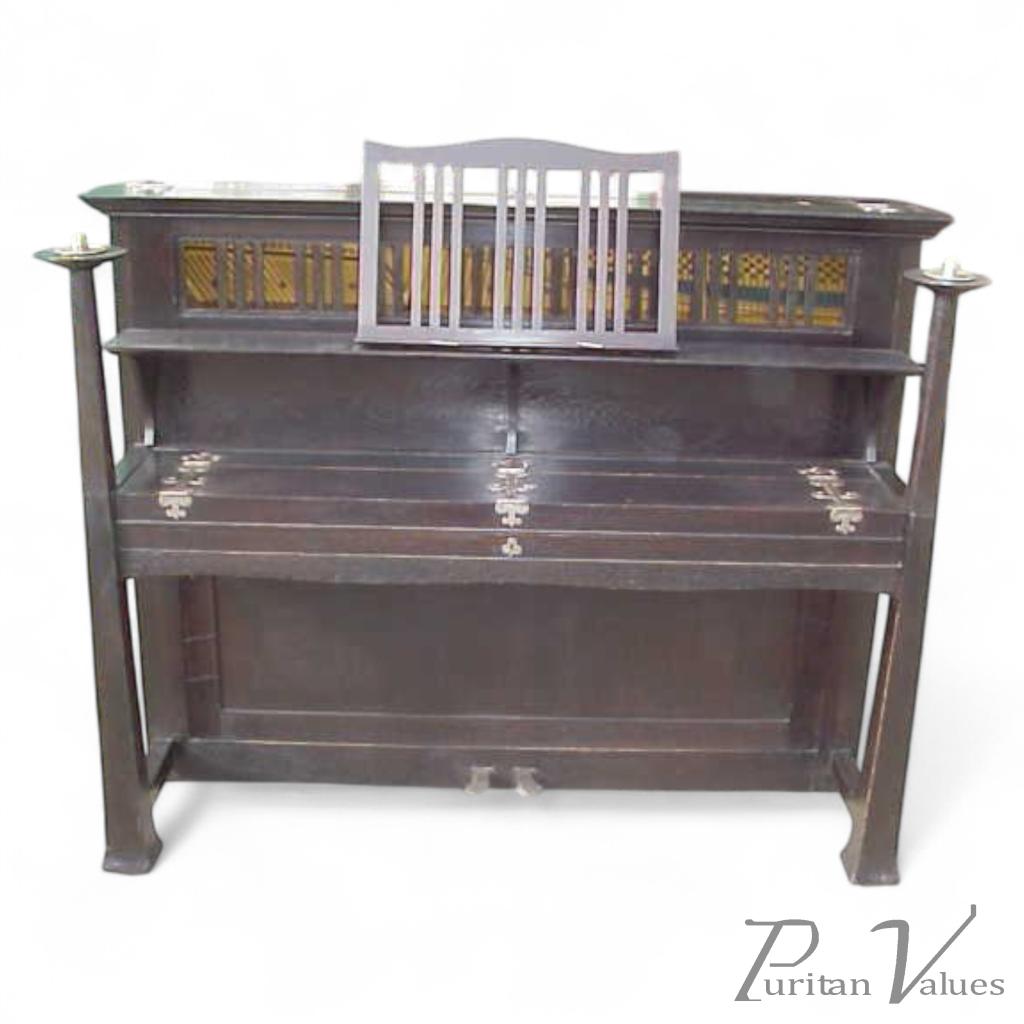Walter Cave, made by Bechstein. A dark oak with an overstrung upright underdamper action, having seven (seven and a quarter octave) with ivory keyboardand and was exhibited in the 1893 Arts and Crafts Exhibition. I do see this piano from time to time if you would like me too find one or let me know when I get another please do e-mail me.
