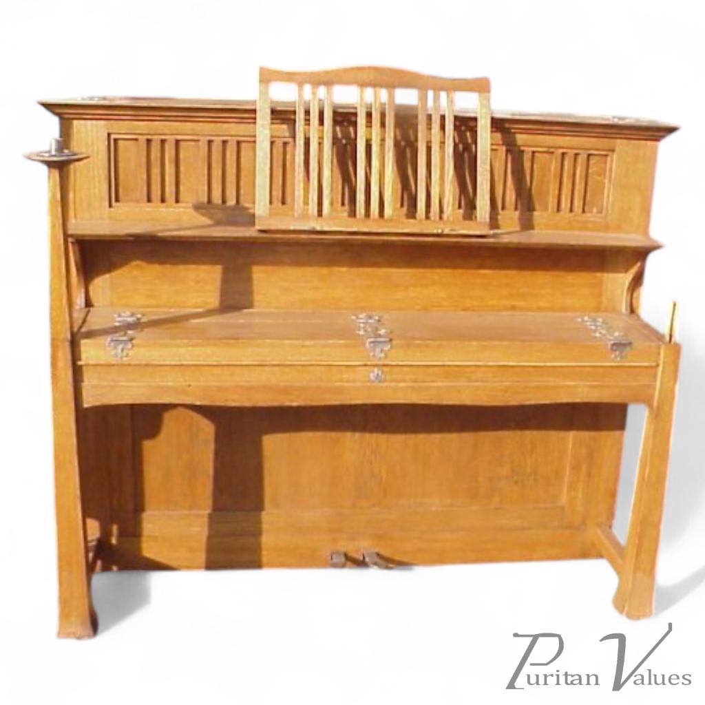 Walter Cave, made by Bechstein An oak piano with an overstrung upright underdamper action, having seven (seven and a quarter octave) with ivory keyboard. Exhibited in the 1893 Arts and Crafts Exhibition. Walter Cave was articled to Sir Arthur Blomfield and set up his own practice in London in 1889. He was a member of the Art Workers’ Guild and used forms of expression very close to those of C. F. A. Voysey. And in 1897 took over one of Voysey’s commissions. A house in Streatham Park, London. Height to top of sheet music stand 52", Depth 26, Width 60 1/2". I do see this piano from time to time if you would like me too find one or let me know when I get another please do e-mail me.