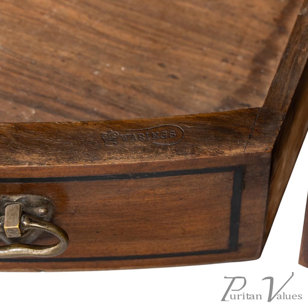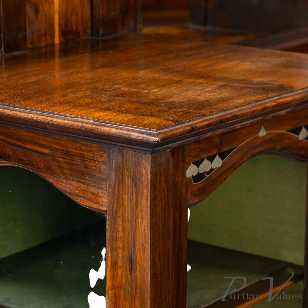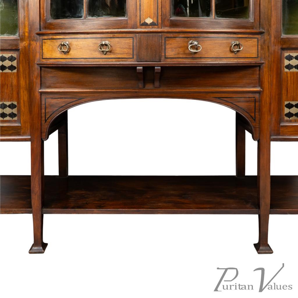 The whole stands on eight square tapering legs joined by a lower display surface, creating an elevated and open stance characteristic of Waring and Gillow’s furniture in the closing years of the nineteenth century. The presence of ebony and pewter inlays, the shaped mirror frame and the glazed compartmental structure place the piece squarely within the firm’s known Arts and Crafts vocabulary.