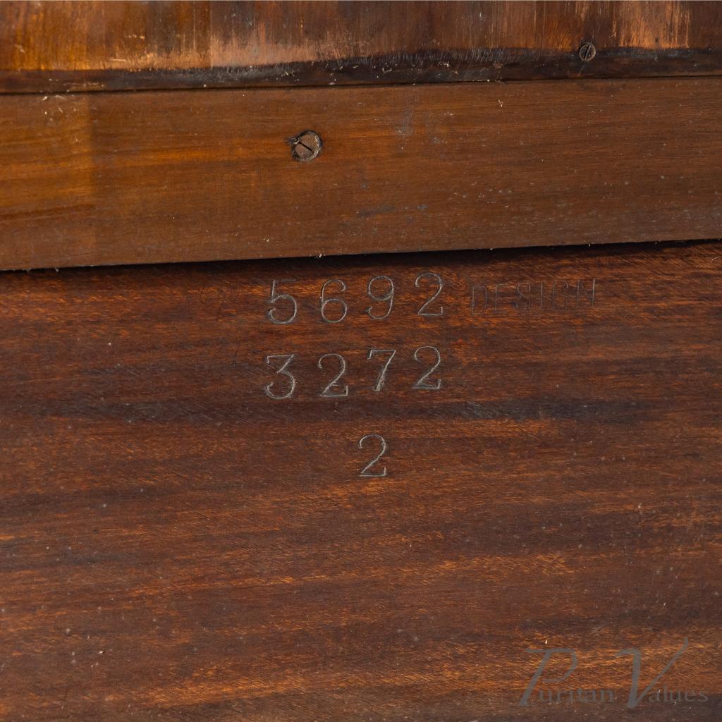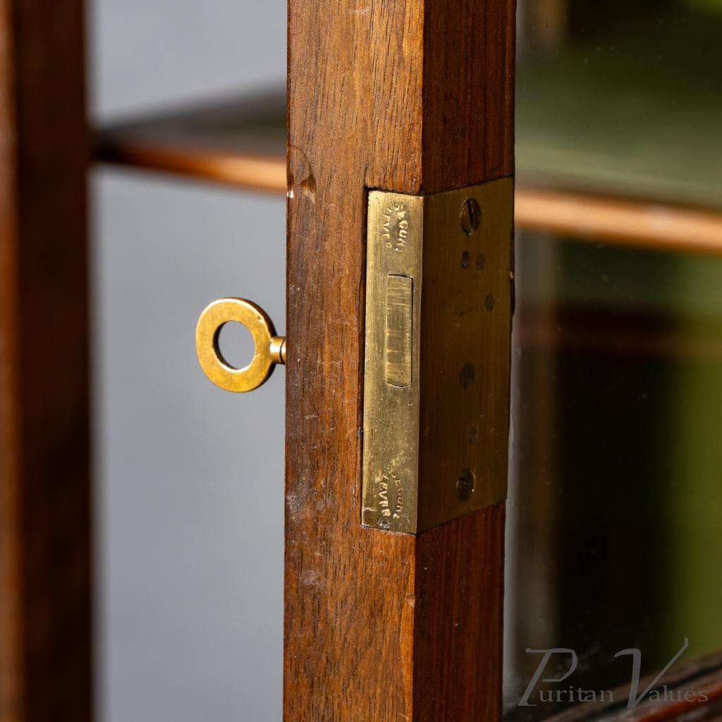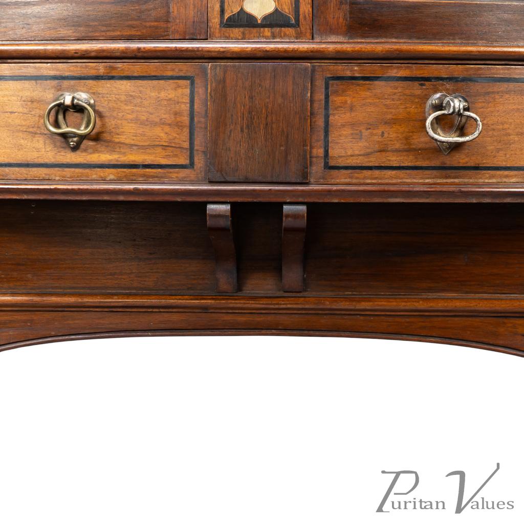 The whole stands on eight square tapering legs joined by a lower display surface, creating an elevated and open stance characteristic of Waring and Gillow’s furniture in the closing years of the nineteenth century. The presence of ebony and pewter inlays, the shaped mirror frame and the glazed compartmental structure place the piece squarely within the firm’s known Arts and Crafts vocabulary.