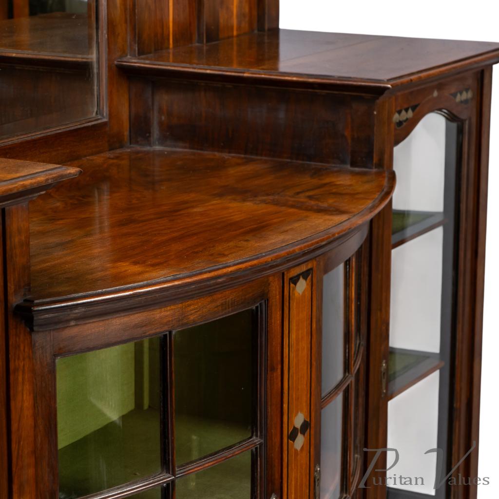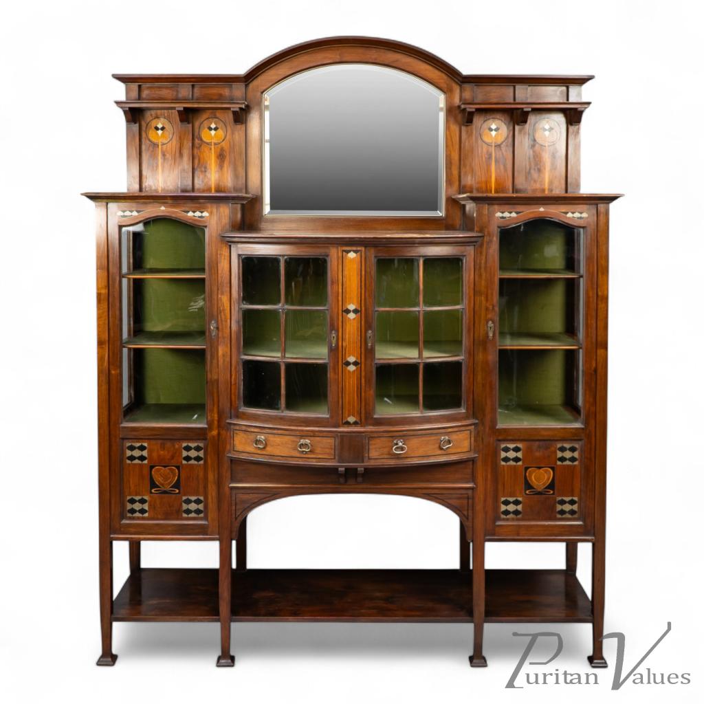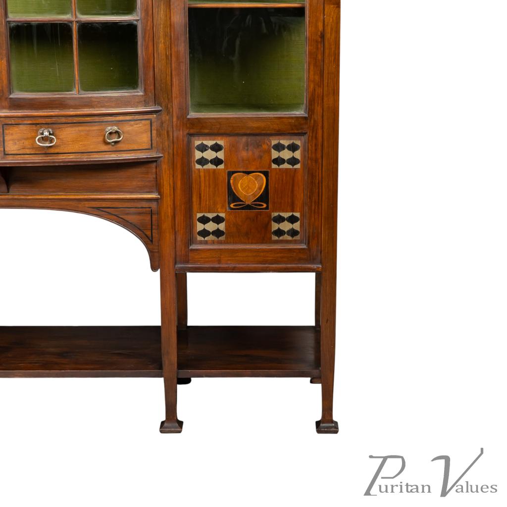 An arched bevelled mirror rises above the central display zone, flanked by two upper shelves with stylised inlaid decoration. Below, the main section incorporates a bow-fronted arrangement with a pair of glazed doors enclosing an interior lined in green fabric and fitted with shelves. On each side are additional glazed cabinets with matching green-lined interiors. The lower doors carry stylised entwined floral and heart inlays set within square fields, balancing the visual weight of the bow fronted centre.