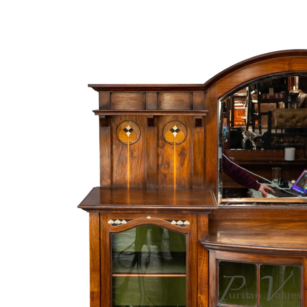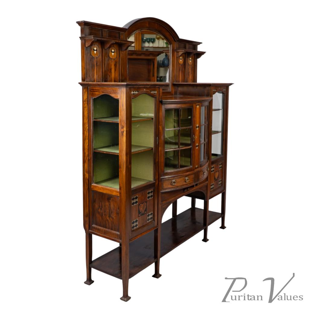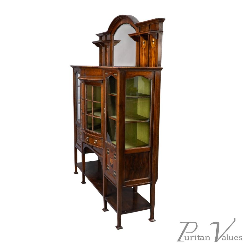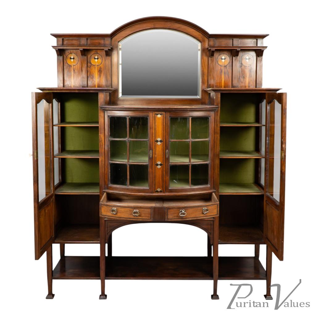 An arched bevelled mirror rises above the central display zone, flanked by two upper shelves with stylised inlaid decoration. Below, the main section incorporates a bow-fronted arrangement with a pair of glazed doors enclosing an interior lined in green fabric and fitted with shelves. On each side are additional glazed cabinets with matching green-lined interiors. The lower doors carry stylised entwined floral and heart inlays set within square fields, balancing the visual weight of the bow fronted centre.