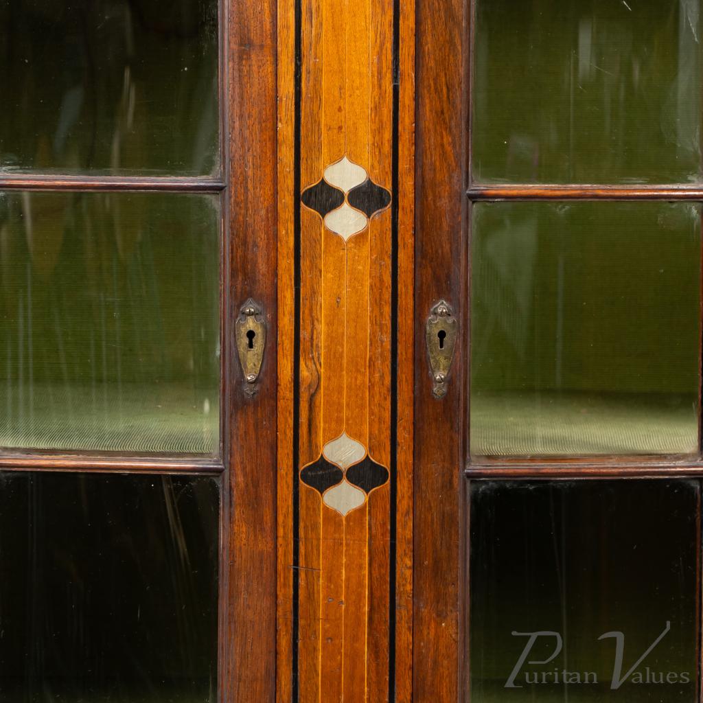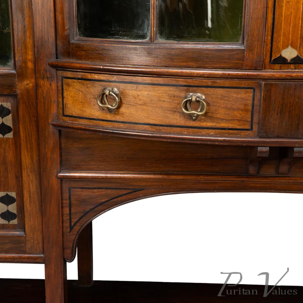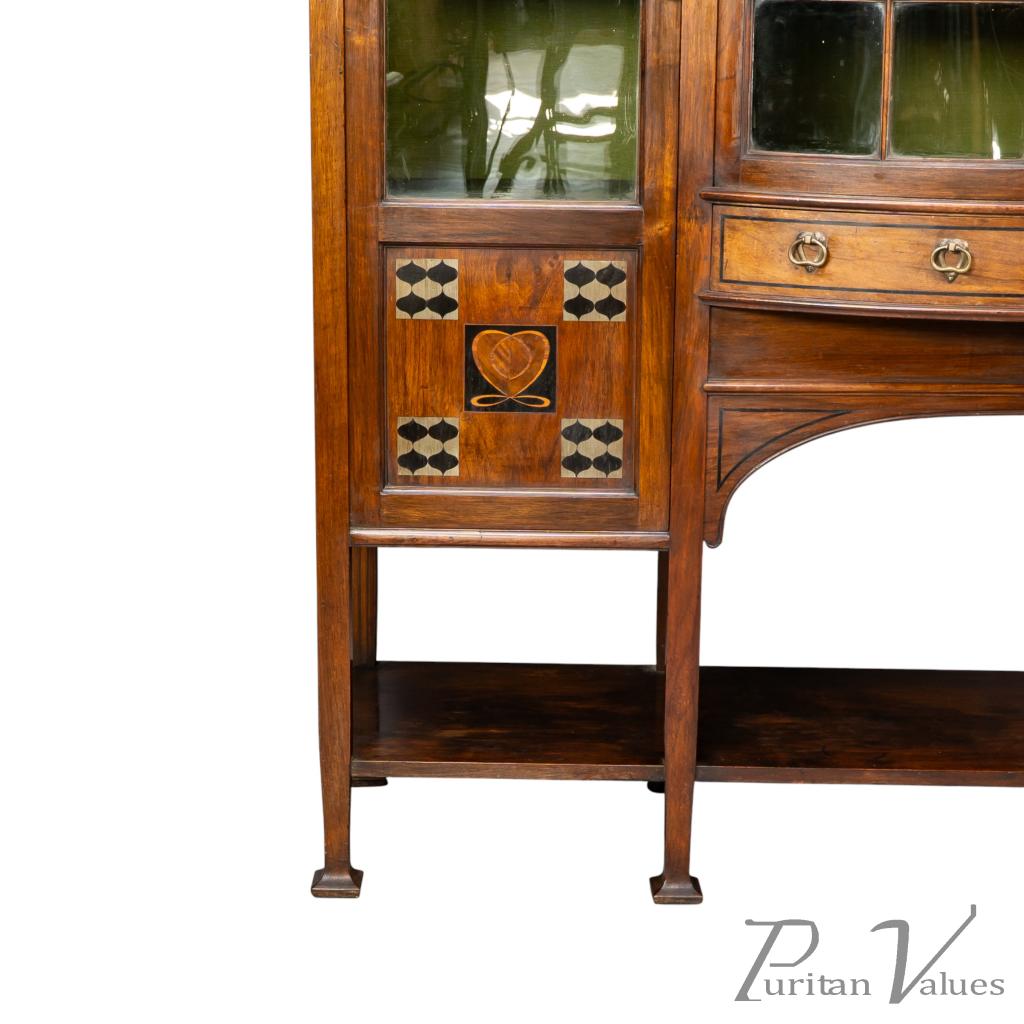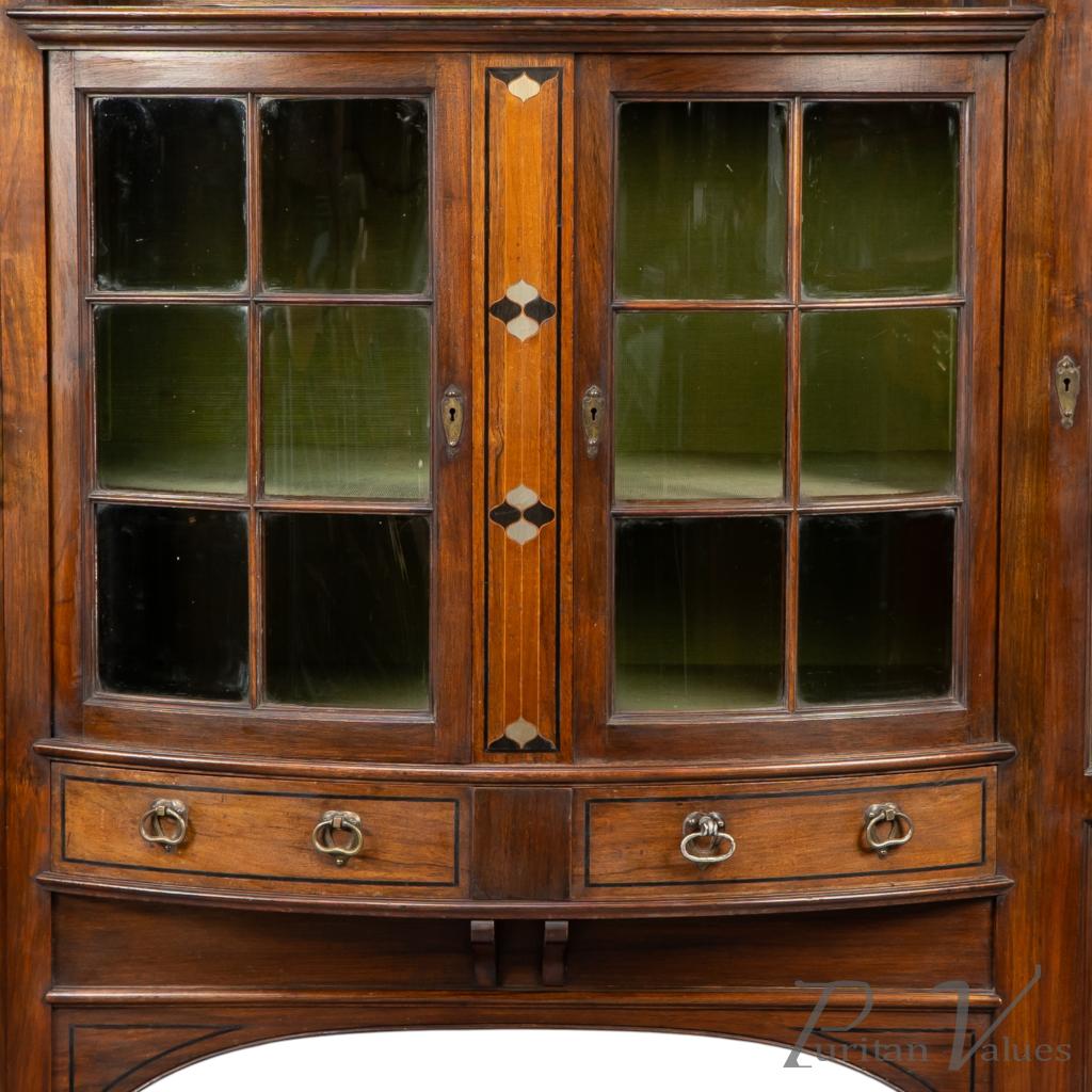 By Waring and Gillow, an Arts and Crafts bow-fronted display cabinet aligned to the Arts and Crafts movement (1880–1910), 1899. The cabinet follows the firm’s late nineteenth-century exhibition style, combining carefully arranged inlay with a tiered architectural composition.