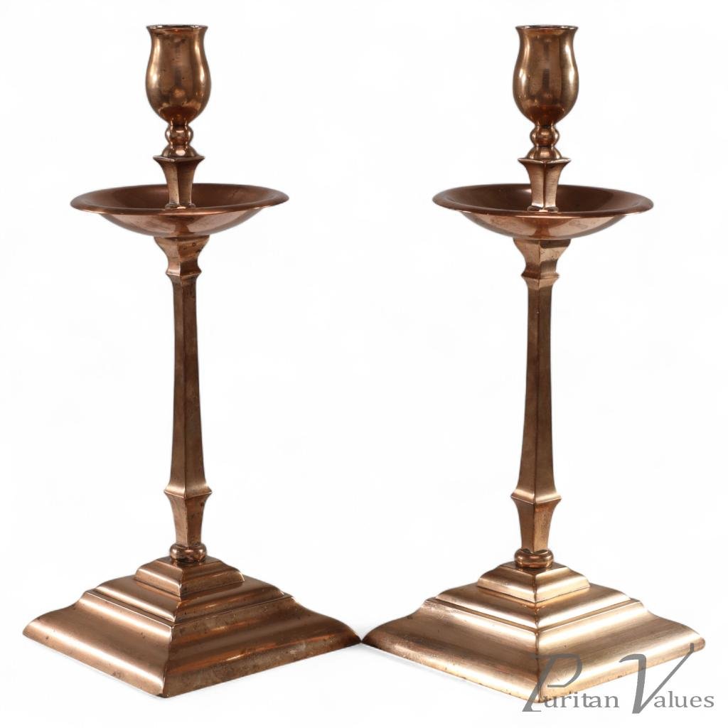 Each candlestick stands on a stepped square copper base that rises through a slender faceted stem to a shallow drip tray and plain socket. The interplay of copper and brass provides a restrained tonal contrast, while the geometric form reveals Benson’s architectural sensitivity to balance and light. His metalwork exemplified a philosophy in which structure itself became ornament.