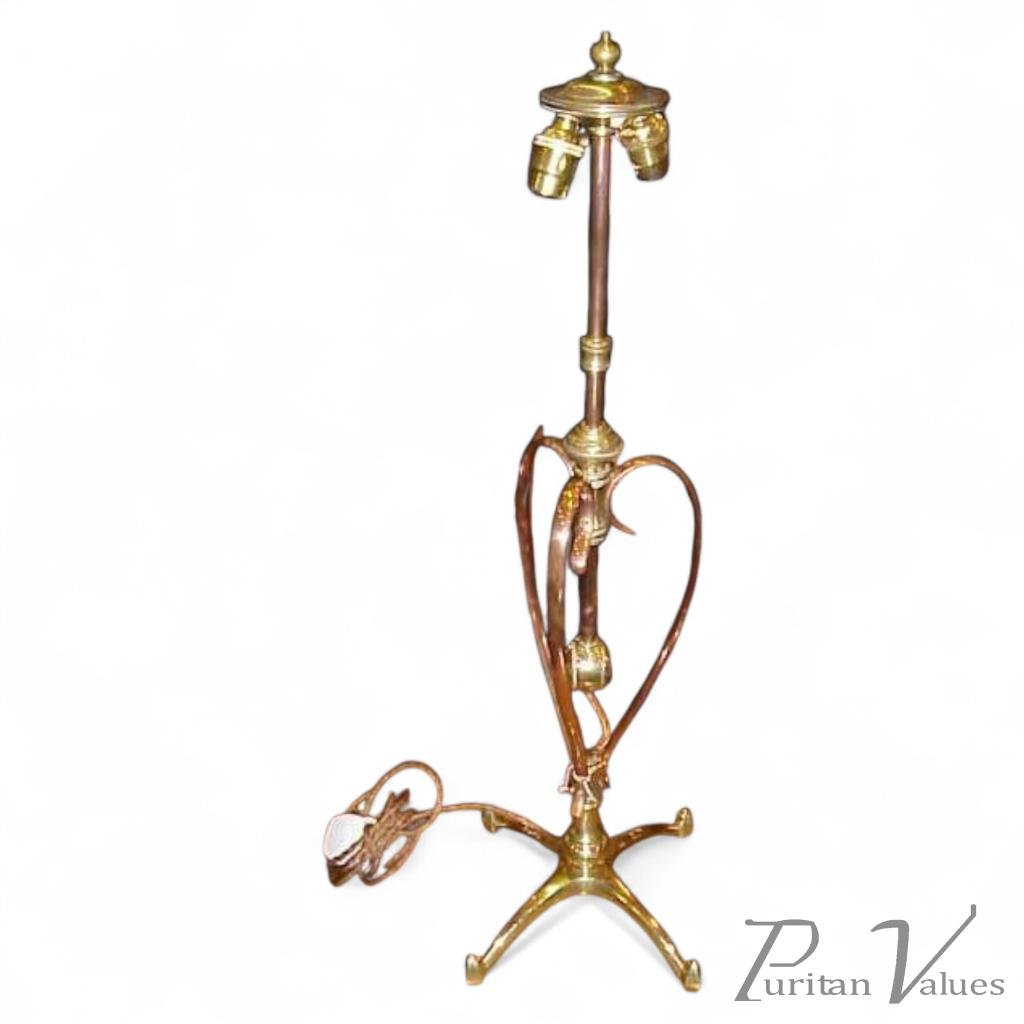 A rare Arts and Crafts adjustable table/desk lamp by WAS Benson. Height fully extended 32" or 27" down, Width at the base 11 1/2". Circa 1900.