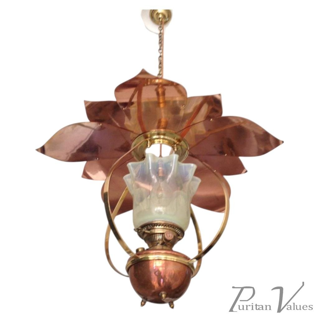 William Arthur Smith Benson (1854-1924). A rare copper and brass lantern with large reflector in the shape of petals retaining the original vaseline shade. Height without chain 27", Width 25".