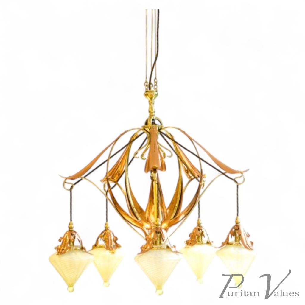 WAS Benson. A rare five arm chandelier with original James Powell Vaseline shades