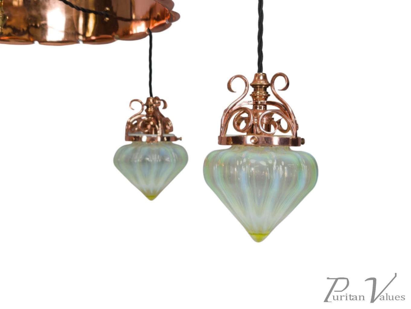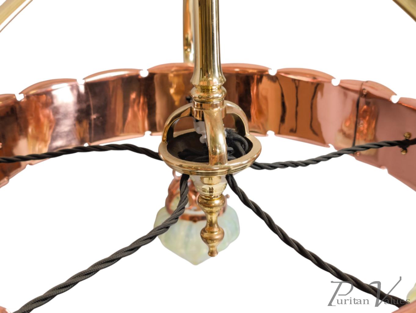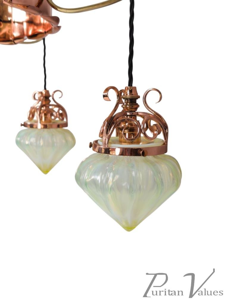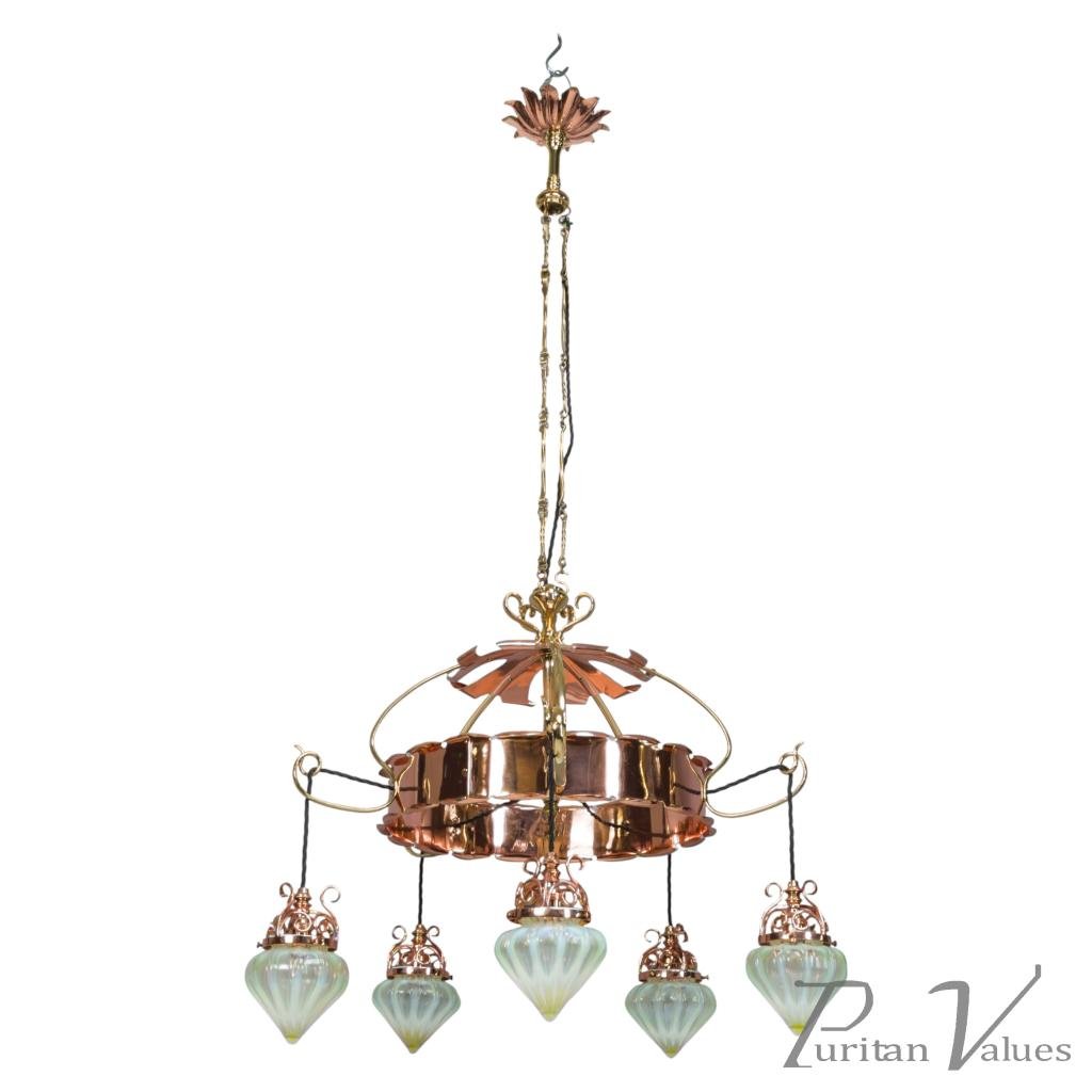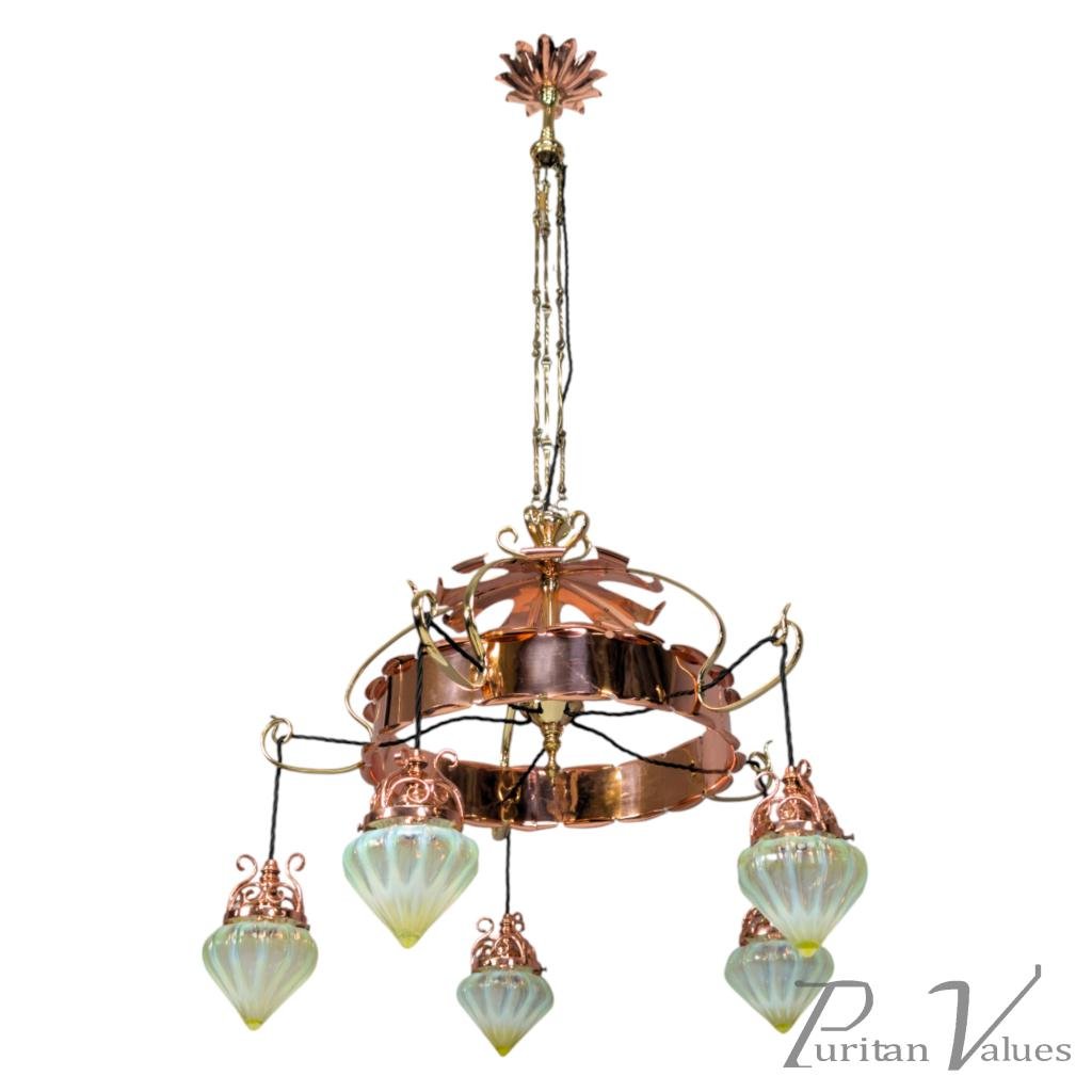 W. A. S. Benson. An Arts & Crafts Copper & Brass Chandelier with 5 Vaseline Shades