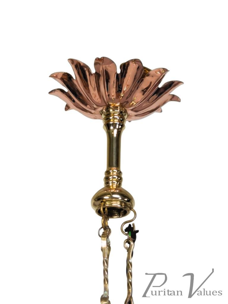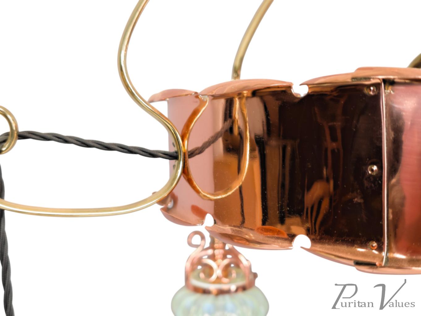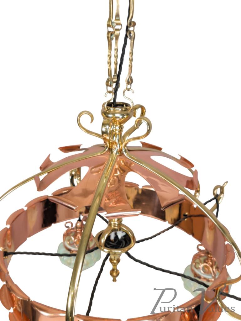 A rare Arts & Crafts copper & brass five-branch chandelier with the original ceiling plate to the top and a turned support below, connecting to five whiplash arms with an upper decorative copper plate with scrolled edges.